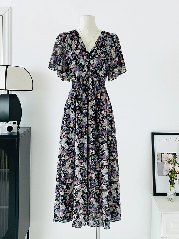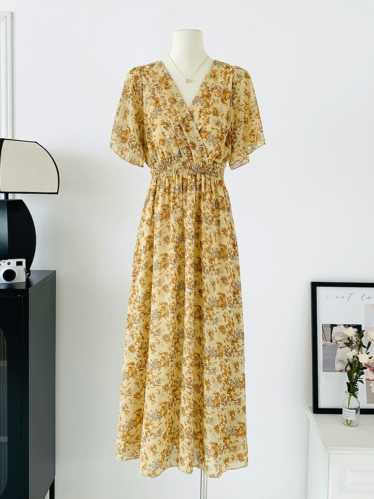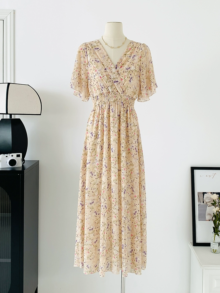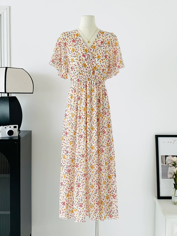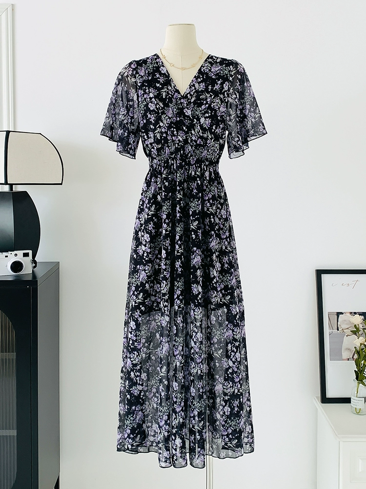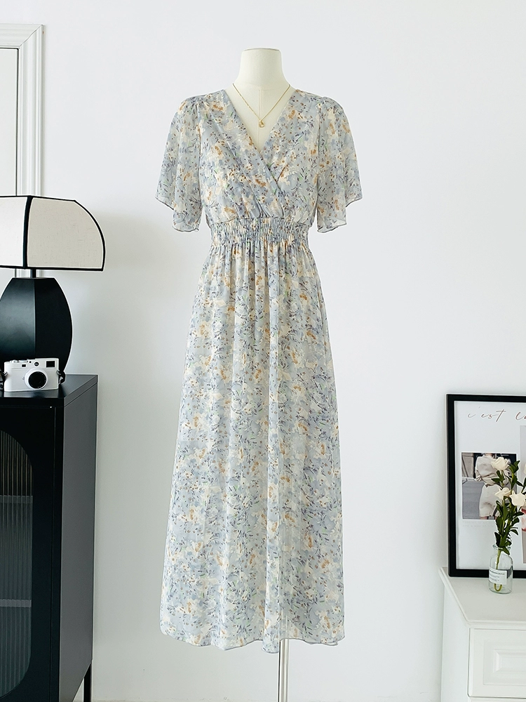 | nameOriginal | Spot real shot seaside vacation dress women's summer sexy V-neck waist slimming long chiffon floral beach dress |