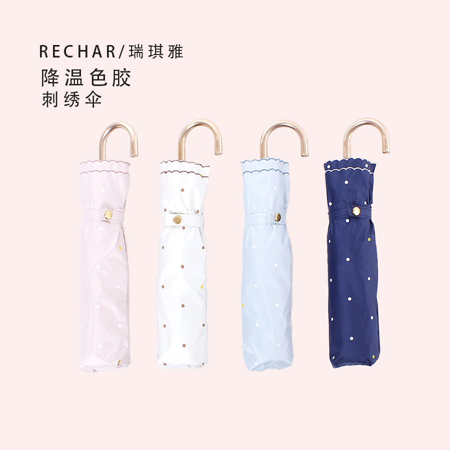 | nameOriginal | Spot SZ208 Golden curved handle bilateral embroidery double color dot cooling color glue sunscreen folding umbrella sunshade |