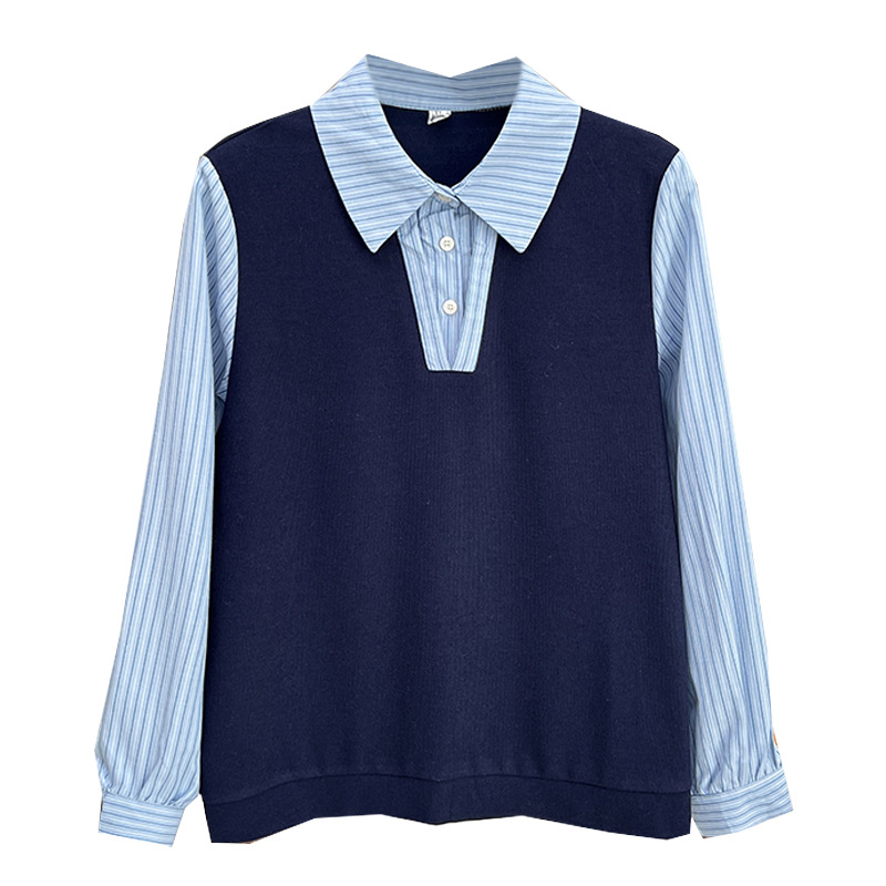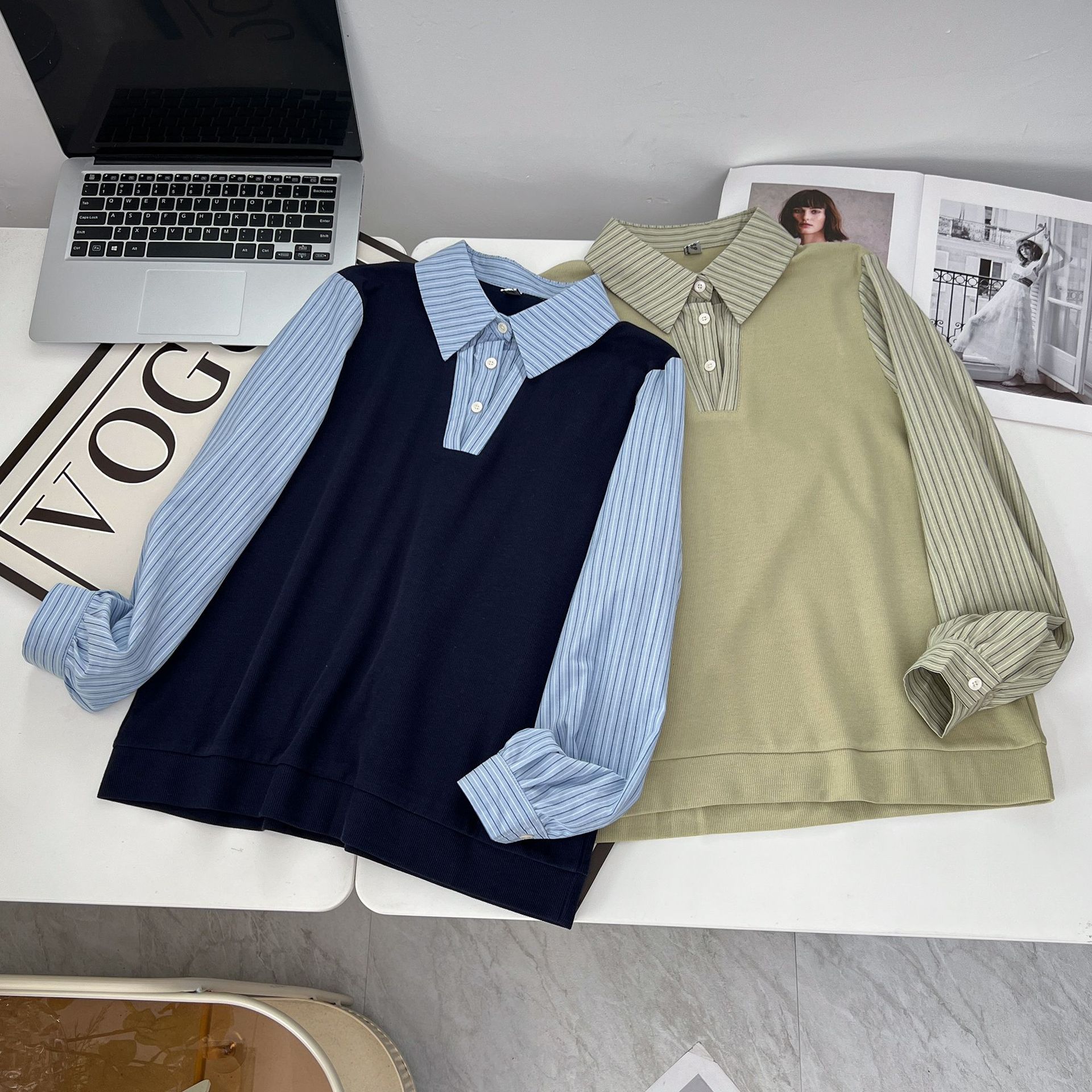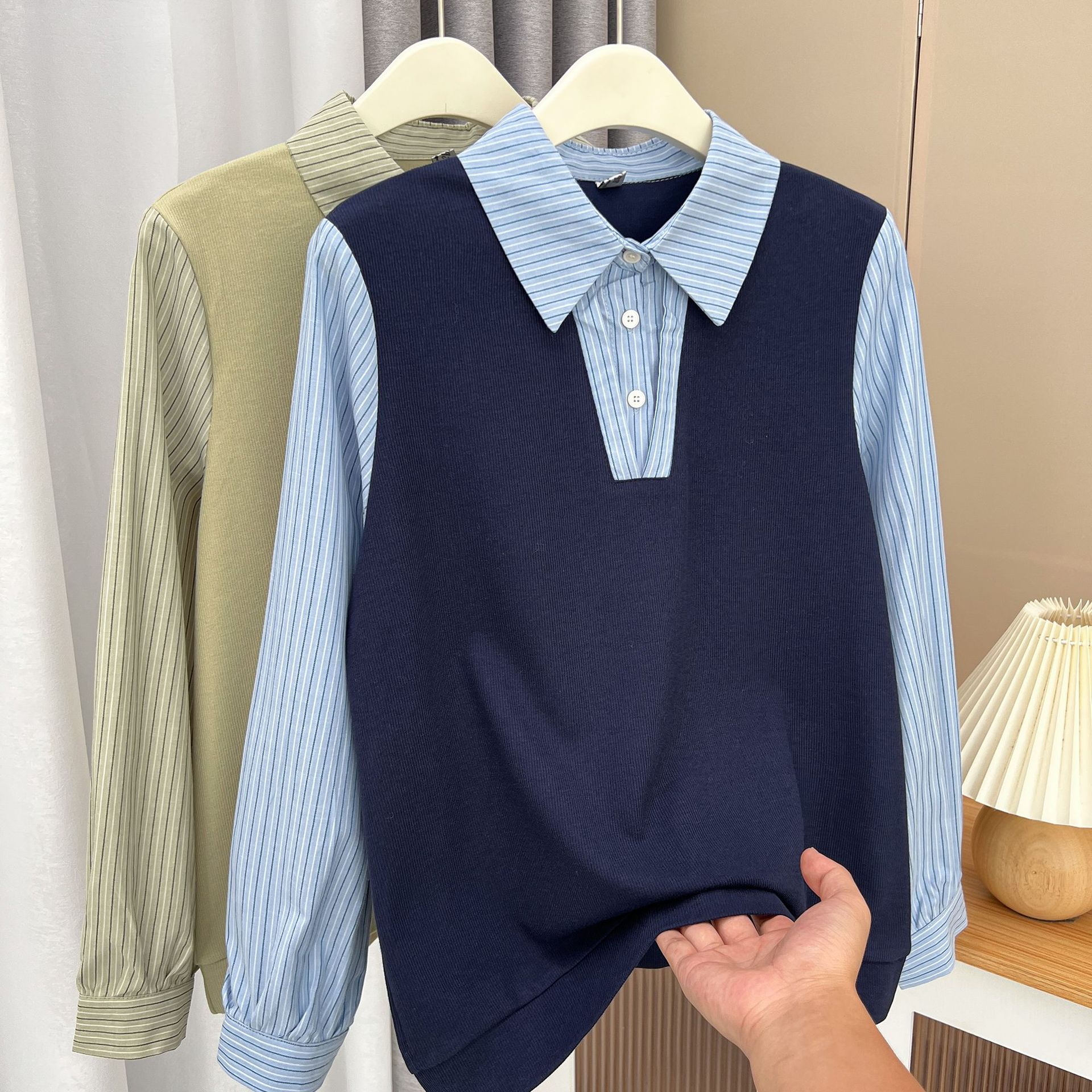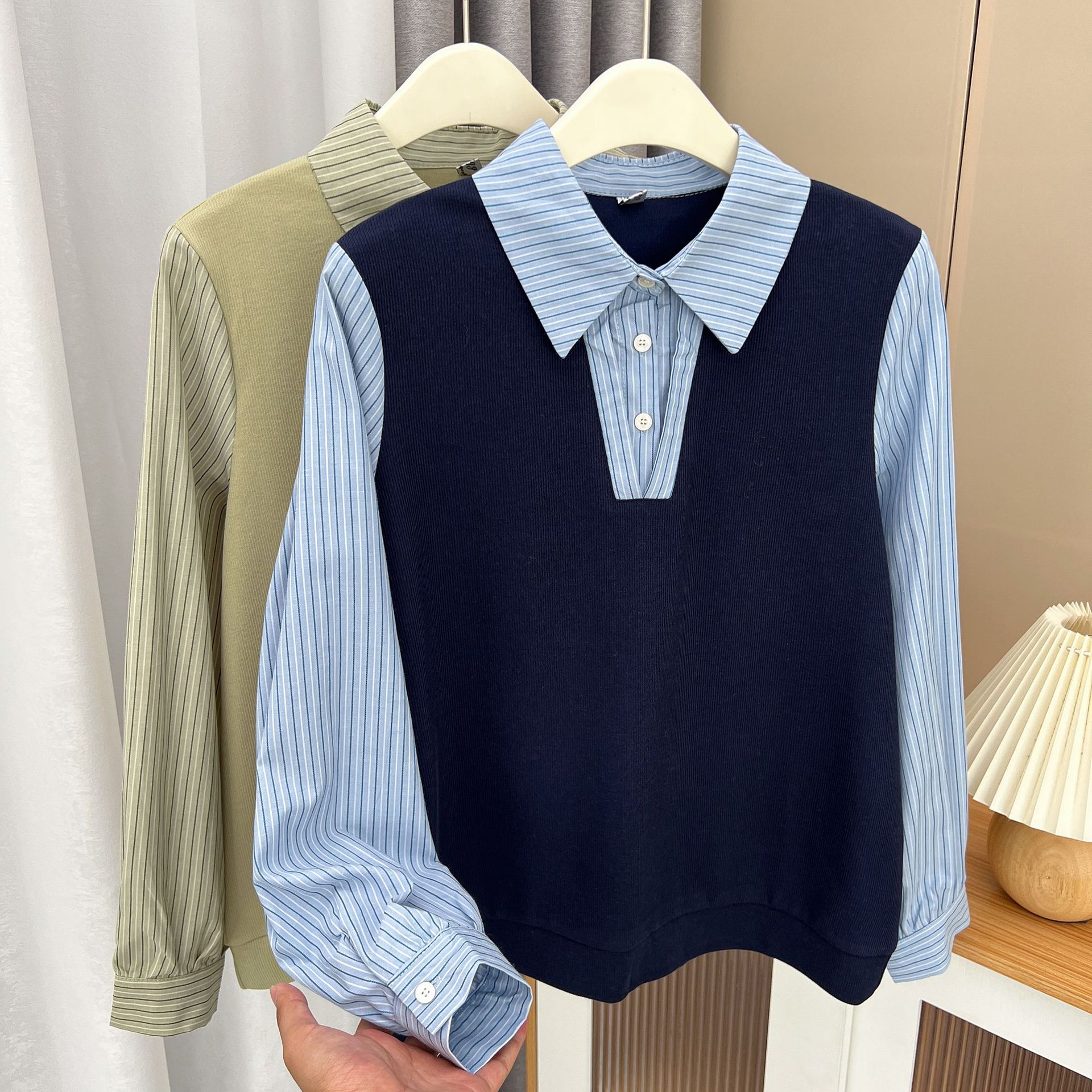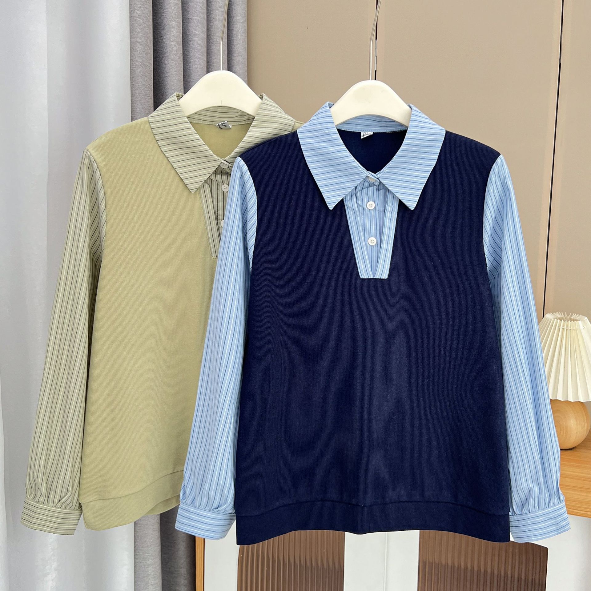 | nameOriginal | Spring 200 Jin Chubby Sister Fashion Joker Striped Stitching Fake Two-piece Shirt Large Size Women's Casual Top 1263 |