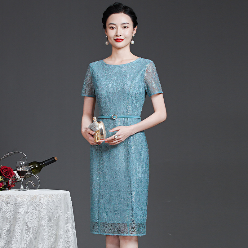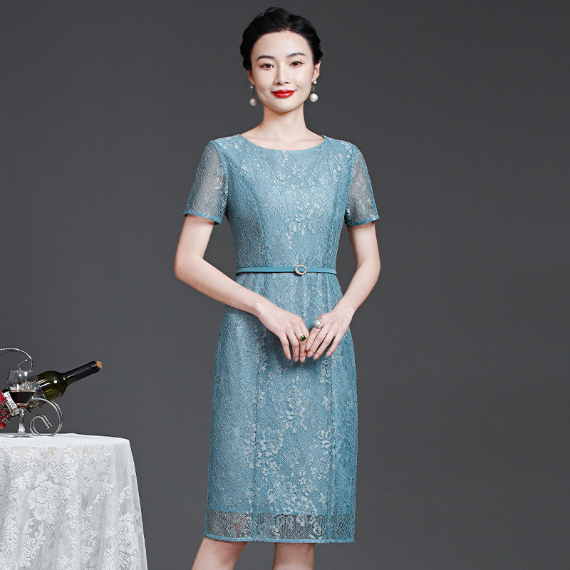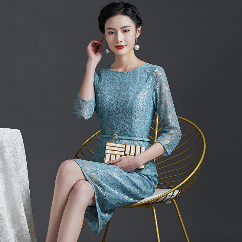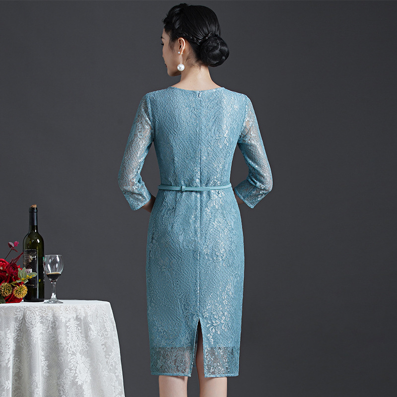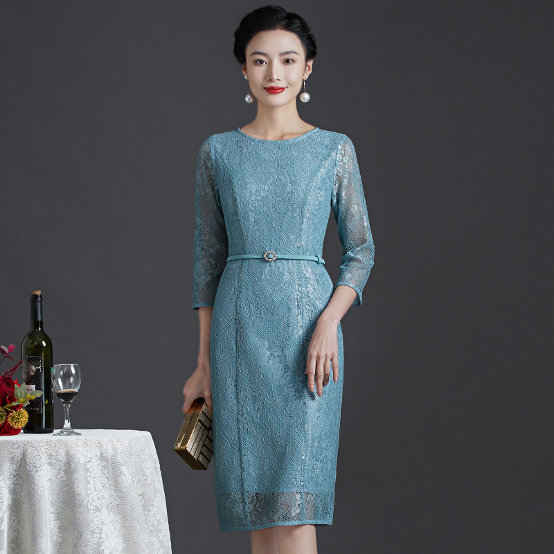 Spring 2023 New Lace Embroidered Light Blue Seven-point Sleeve Dress for Middle-aged and Elderly Women’s Wear