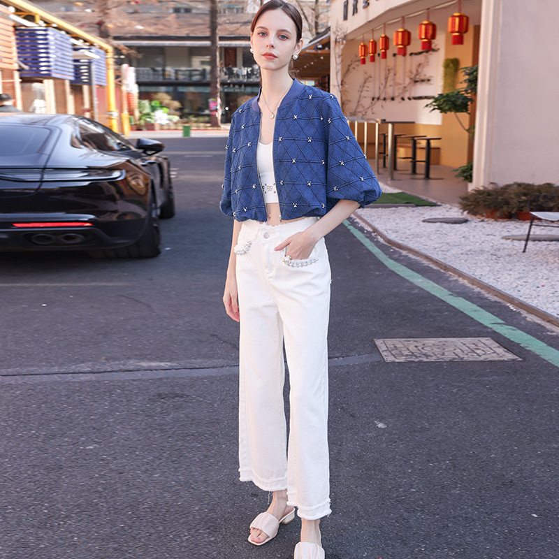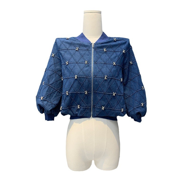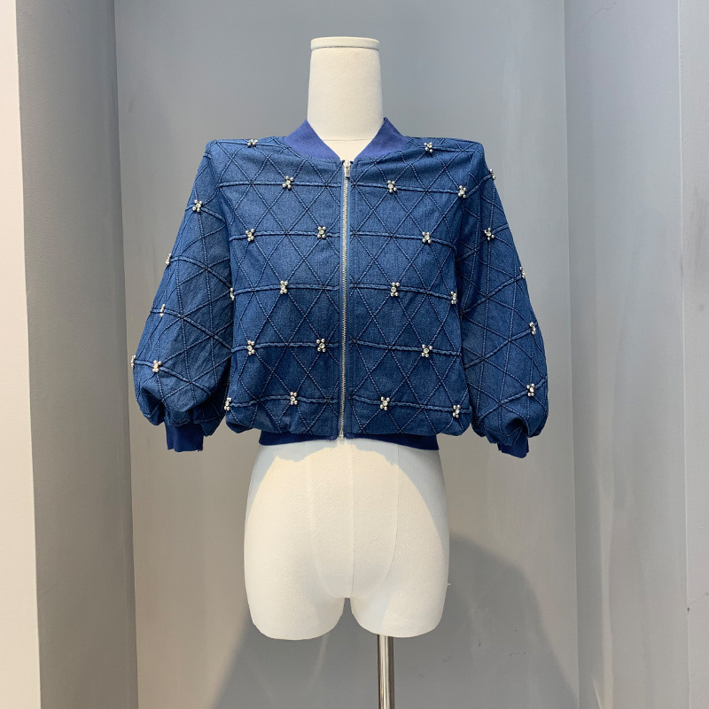 Spring 2024 Nanyou women's clothing ten or three lines high-grade popular baseball collar heavy industry rhombus Denim short coat top