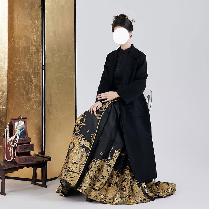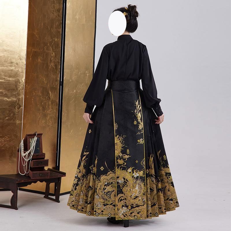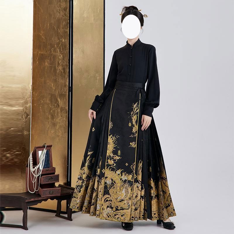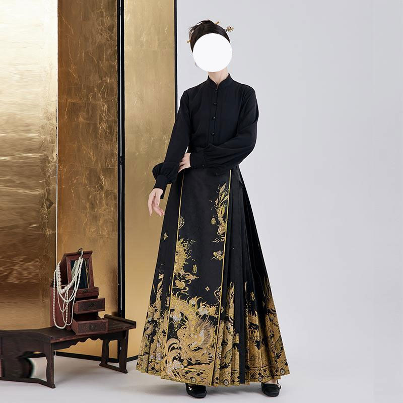| nameOriginal | Spring 2024 new Hanfu improved stand collar black shirt top high waist bright long horse face skirt set |