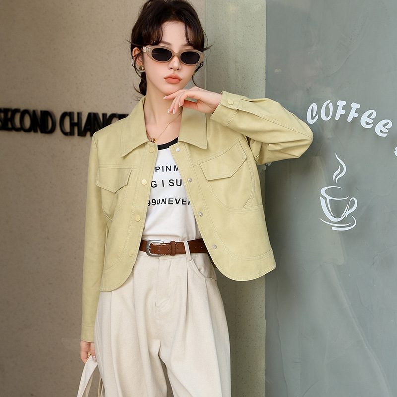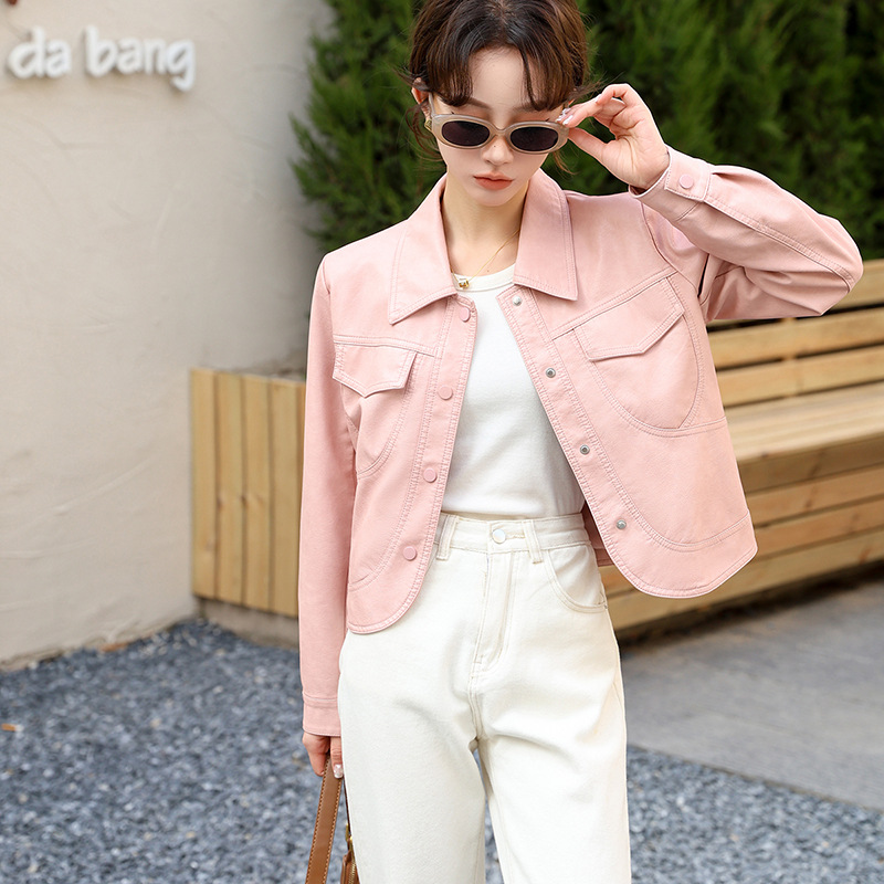 | nameOriginal | Spring 2024 New Korean Short Leather Jacket Women's Slim-fit Simple All-match Lapel Protein Leather Jacket Wholesale |