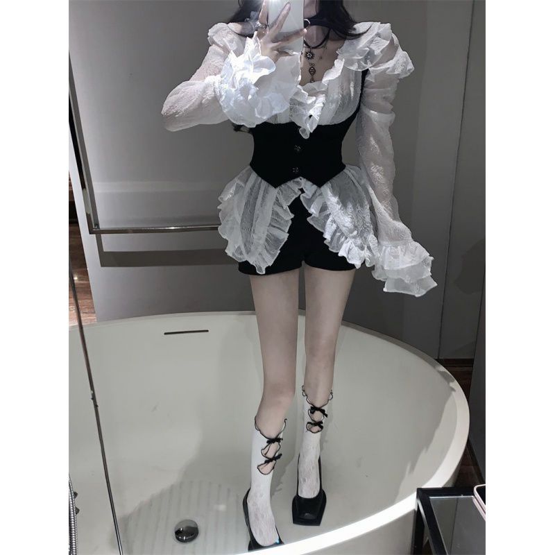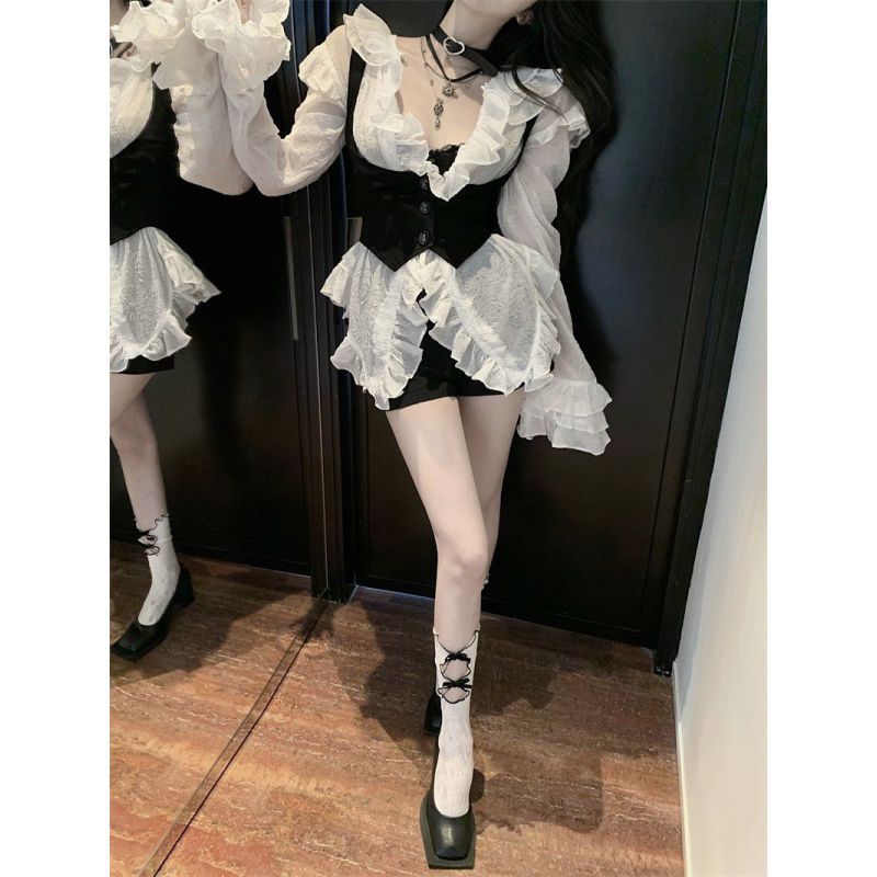 | nameOriginal | Spring and Autumn 2024 Shirt Niche Chic Design Sense Ruffled Women's White Long Sleeve Shirt Vest Two-Piece Trendy |