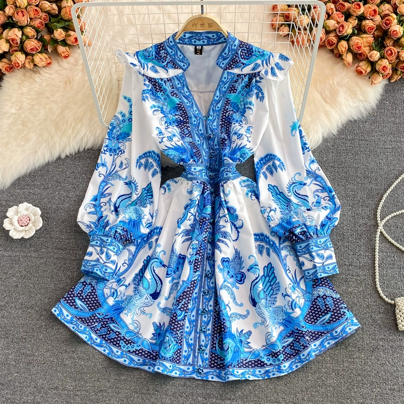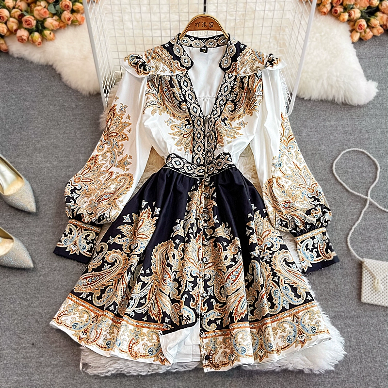 | nameOriginal | Spring and autumn Australian niche retro palace style printed ruffled deep V-neck lantern sleeves high-waist slim dress |
