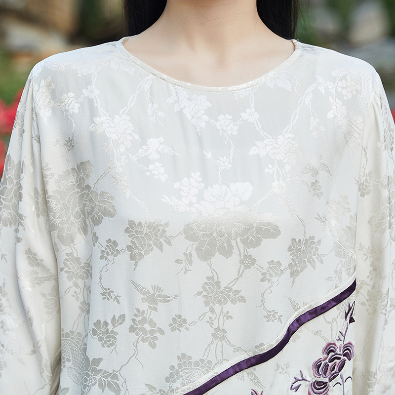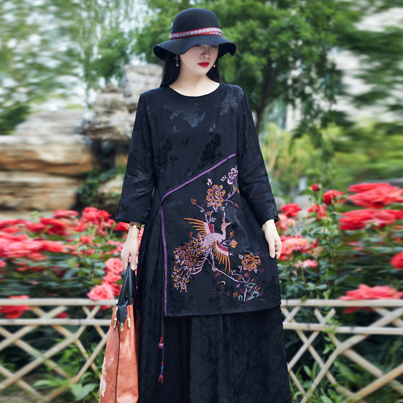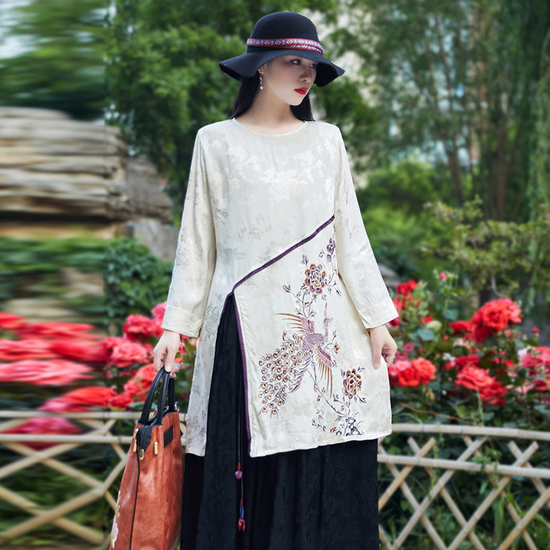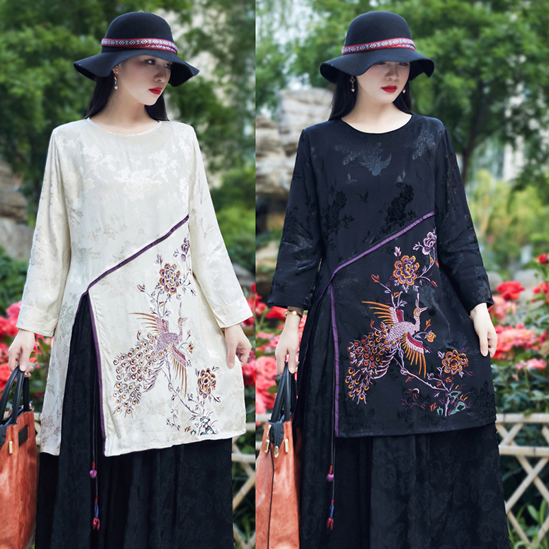 Spring and Autumn Ethnic Style Women's Satin Embroidered Large Size Women's Top Pullover Mid-length Vintage Ethnic Style Shirt