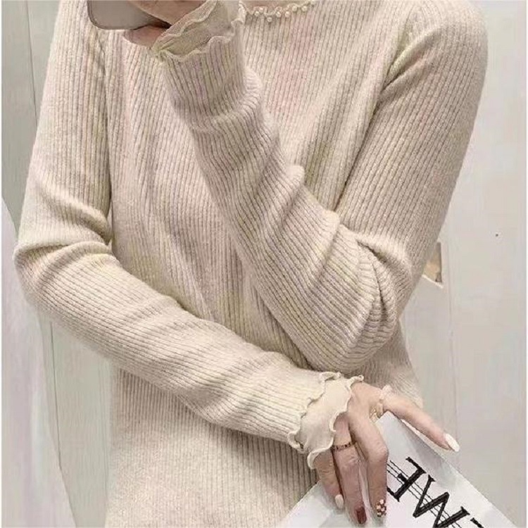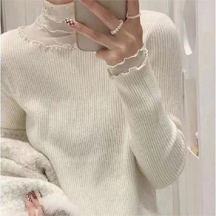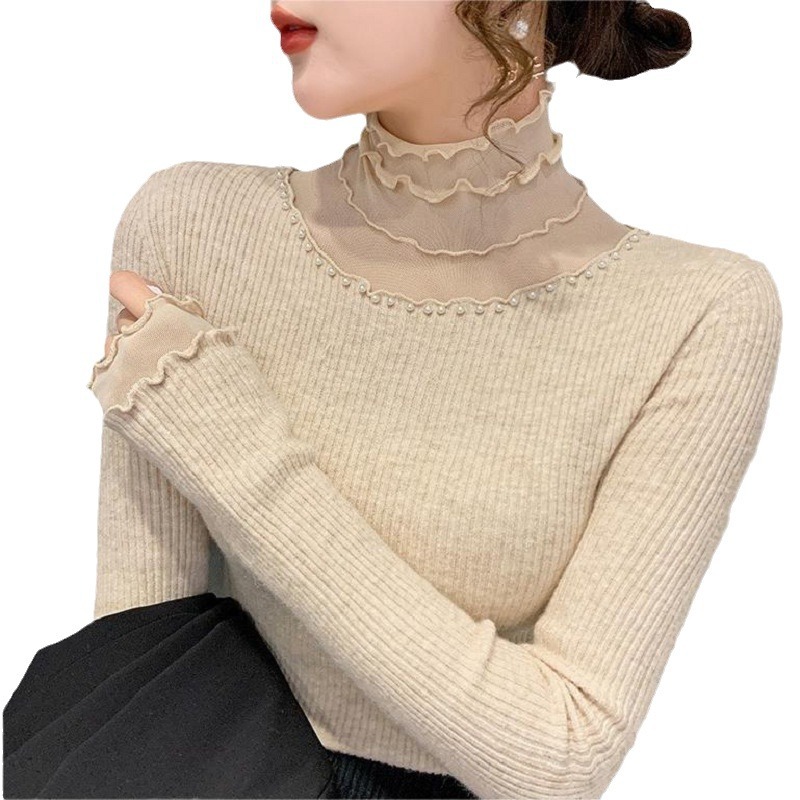 Spring and Autumn fashionable elegant pearl pile high collar long sleeve solid color slim transparent lace lace lace collar bottoming shirt for women