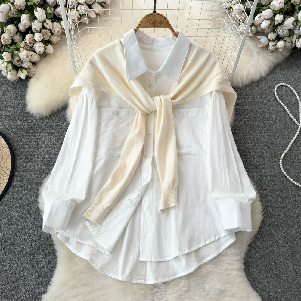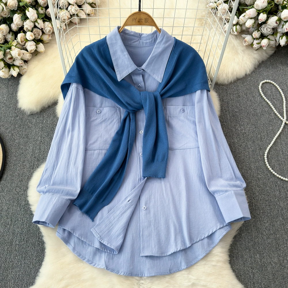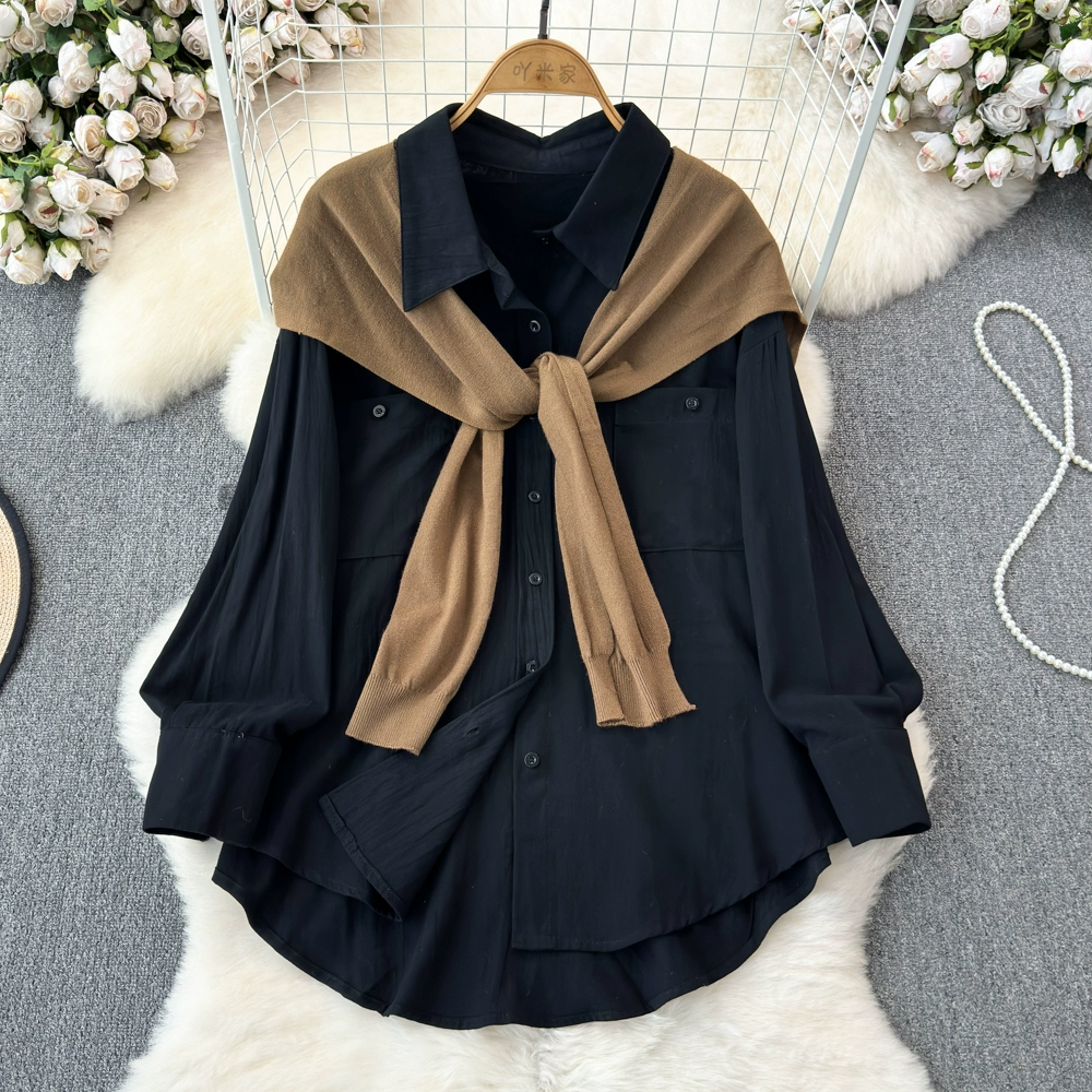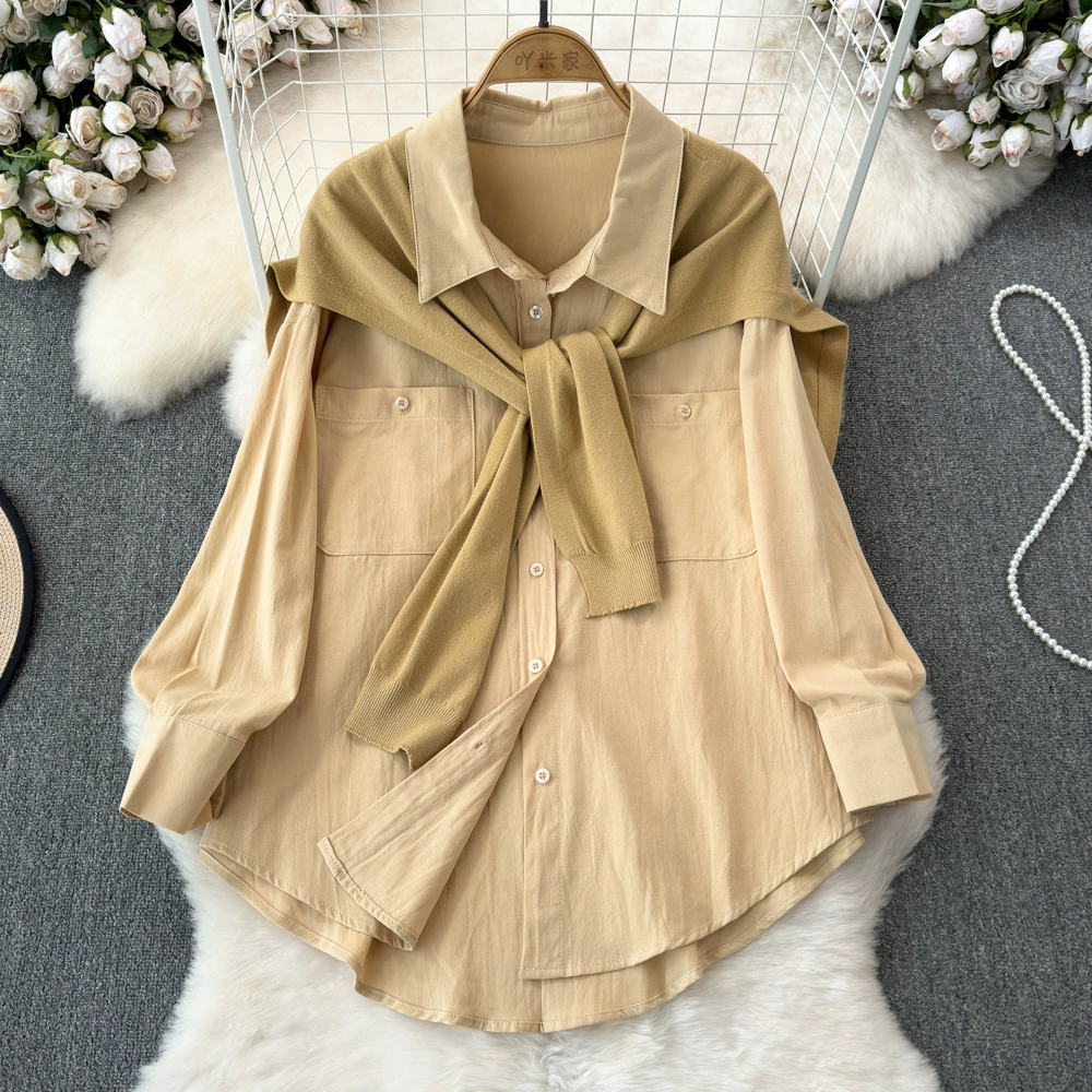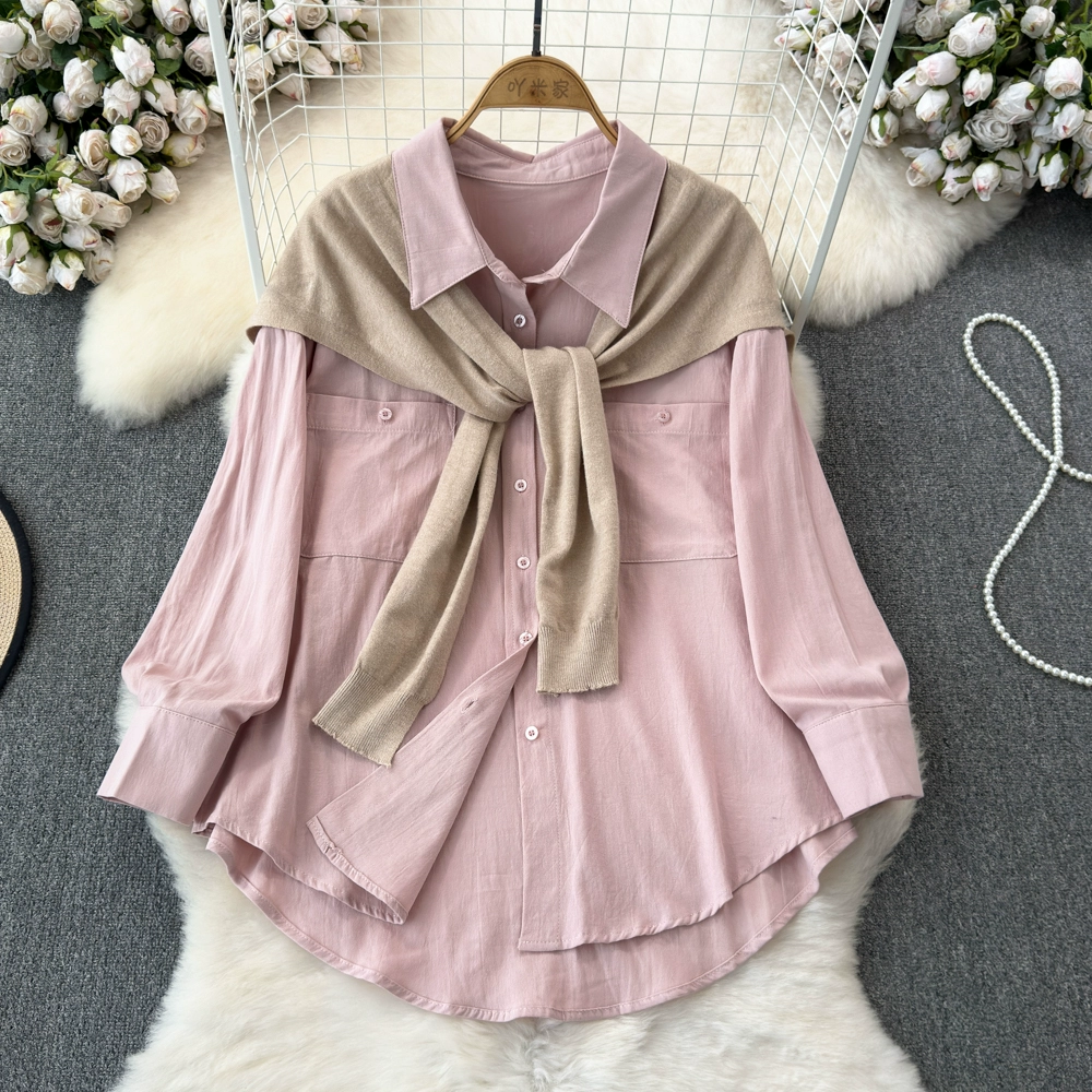 Spring and Autumn Korean Dongdaemun temperament pocket lapel long-sleeved loose versatile pink shirt two-piece shawl top