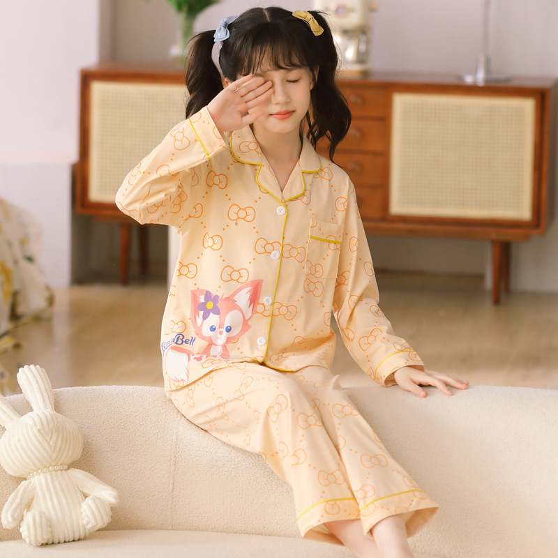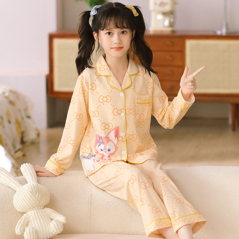 Spring and Autumn new children’s pajamas cartoon girls’ summer cardigan lapel baby long-sleeved trousers homewear suit