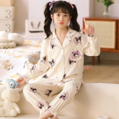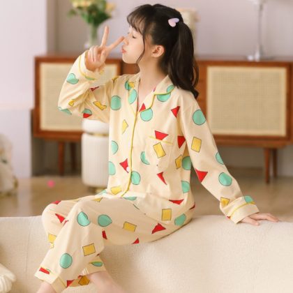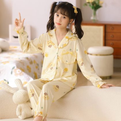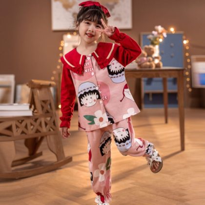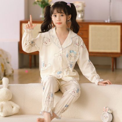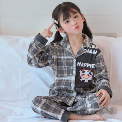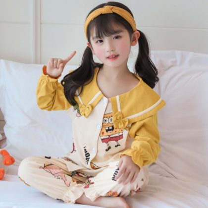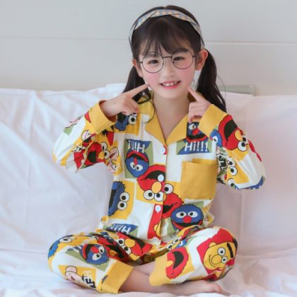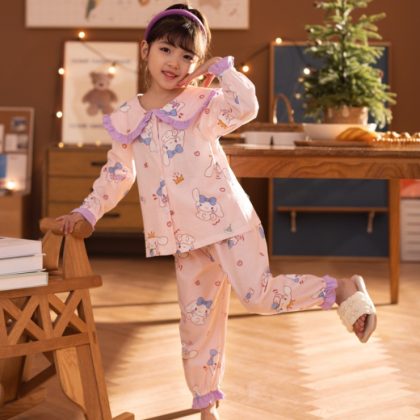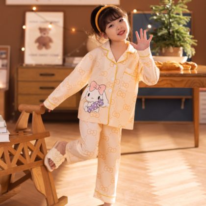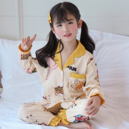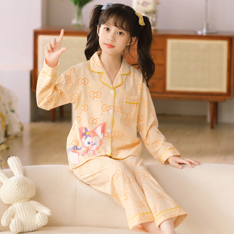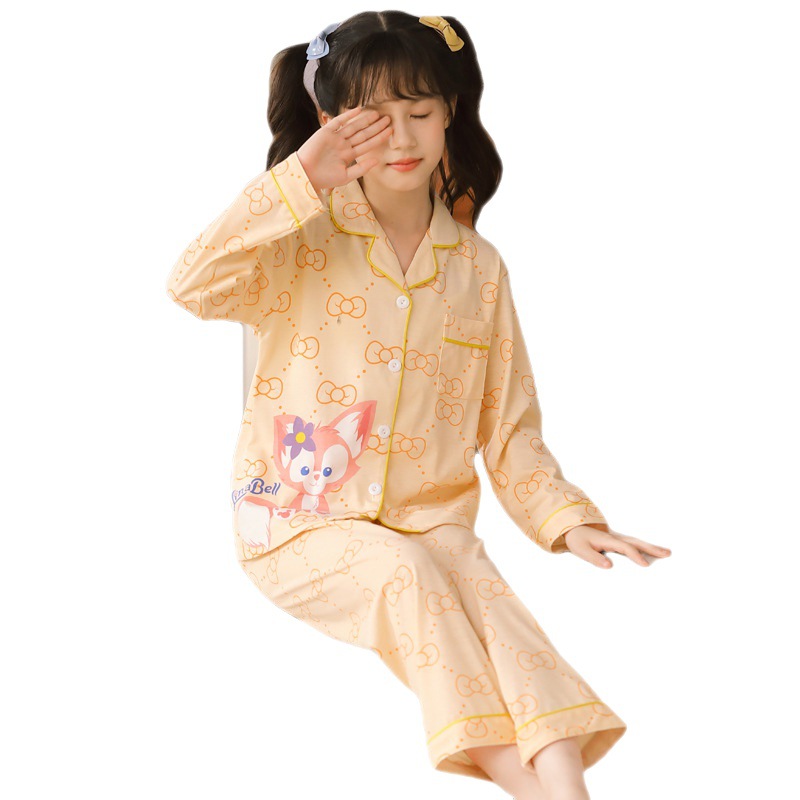 Spring and Autumn new children’s pajamas cartoon girls’ summer cardigan lapel baby long-sleeved trousers homewear suit