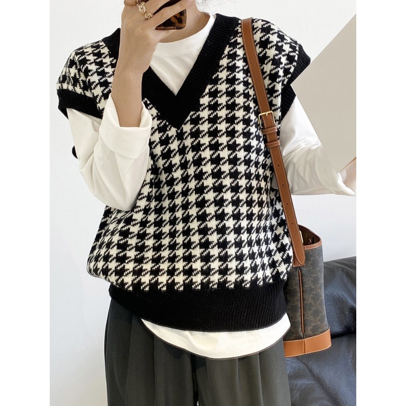 | nameOriginal | Spring and Autumn New houndstooth sweater vest women's contrast color knitted waistcoat Korean style loose V-neck outer vest |