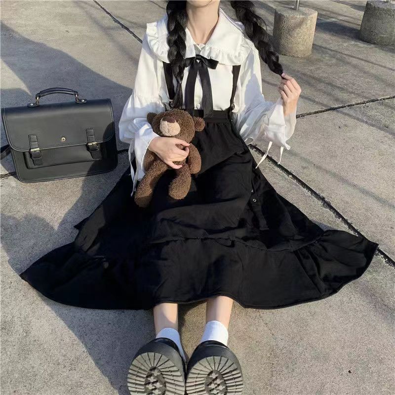 | nameOriginal | Spring and Autumn New Korean Baby Doll Collar Shirt with Bow Mid-length Skirt Loose Female Student One-piece Trendy suit |