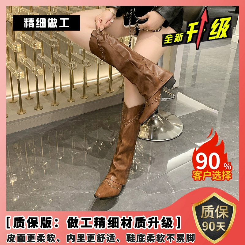 Spring and Autumn Pointed Toe Thick Heel Retro Long Western Cowboy Boots