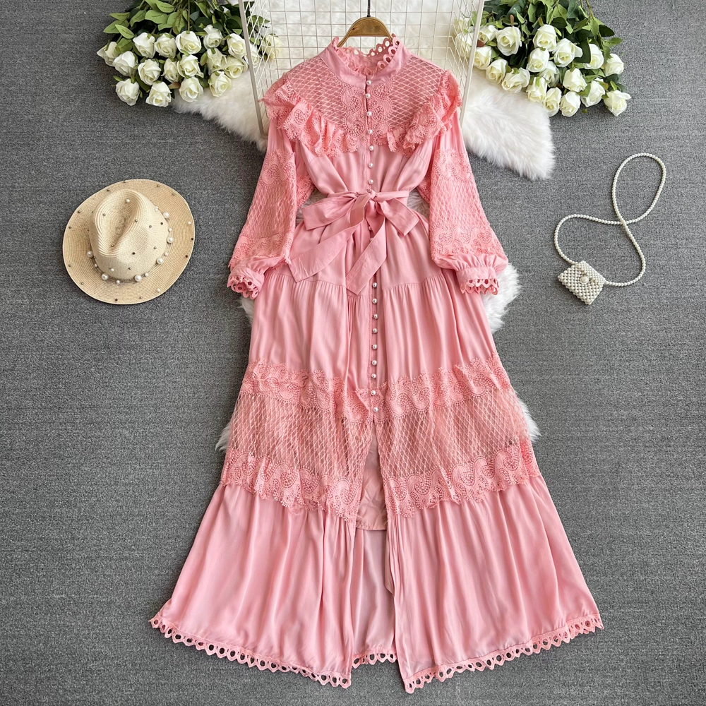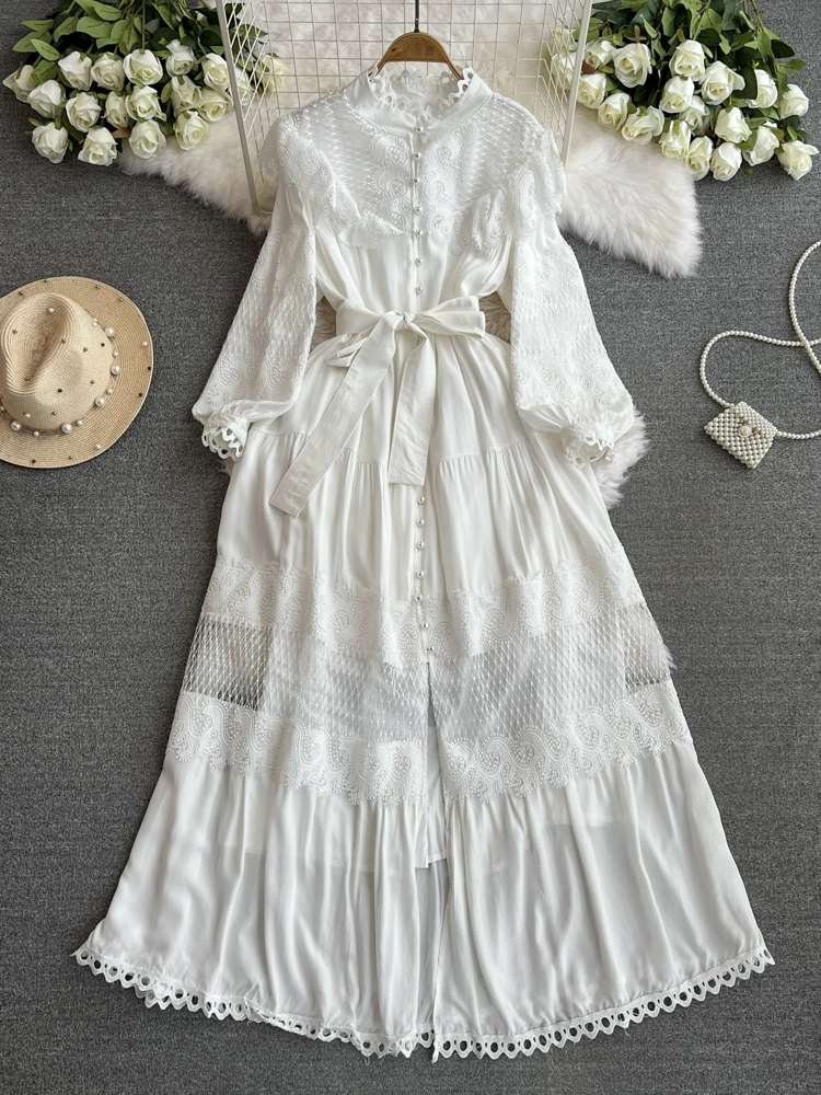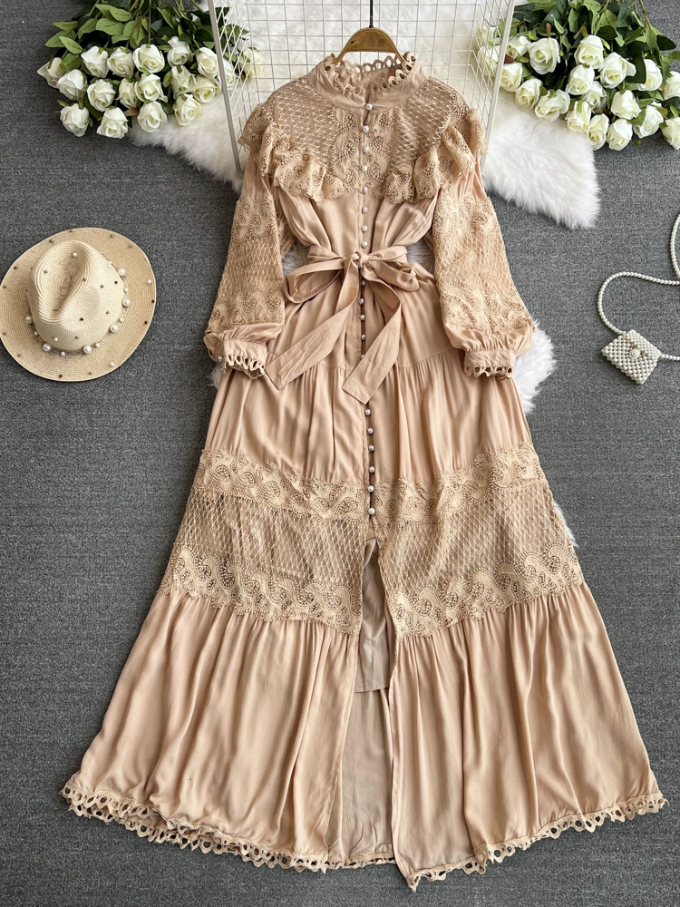Spring and Autumn Retro Lantern Stand Collar Single Breasted Dress