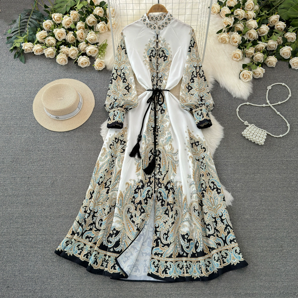 | nameOriginal | Spring and autumn retro palace style long-sleeved stand-up collar waist slimming single-breasted A-line positioning printed dress |