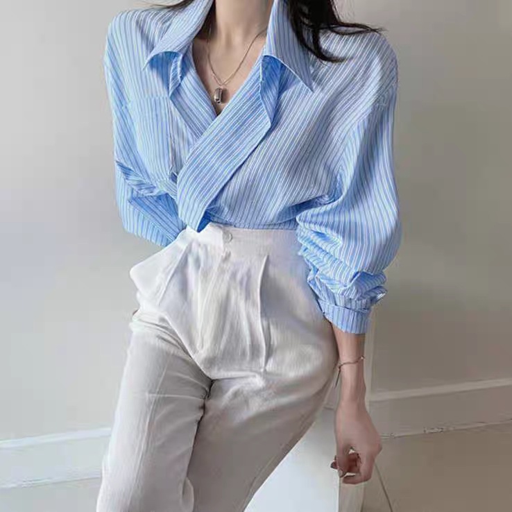 | nameOriginal | Spring and Autumn South Korea Gentle Striped White Lasel Single-Breasted Loose Casual Long-Sleeved Shirt |