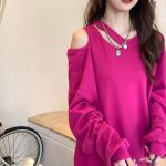 Spring and Autumn Thin Pitaya Color Shoulder Sweater Women’s Loose Korean-style New All-match Pocket Spice Girl Long-sleeved Top