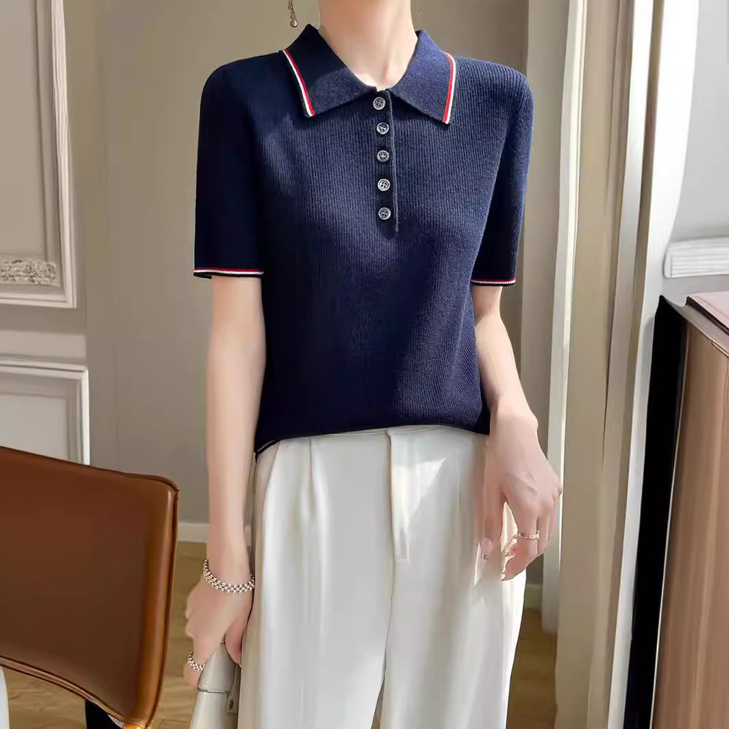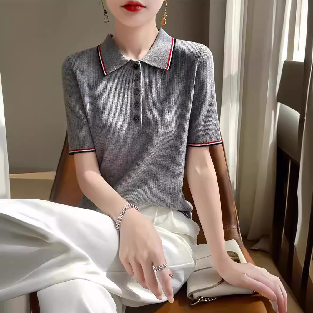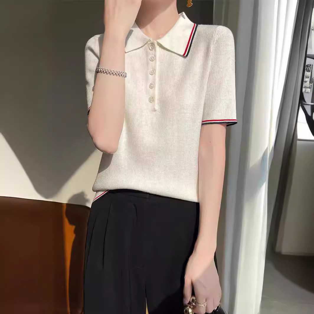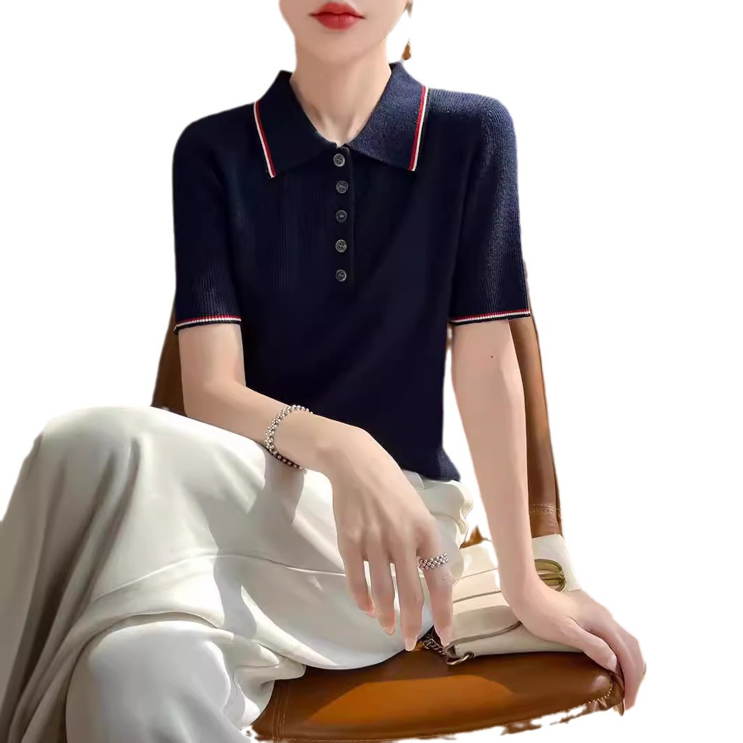 | nameOriginal | Spring and Summer 2024 New Arrival Worsted Wool Colorblock Knitted Short-sleeved T-shirt Women's Polo Collar Half-sleeved Commuter All-match Top |