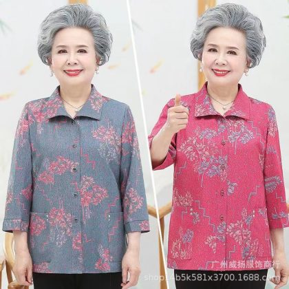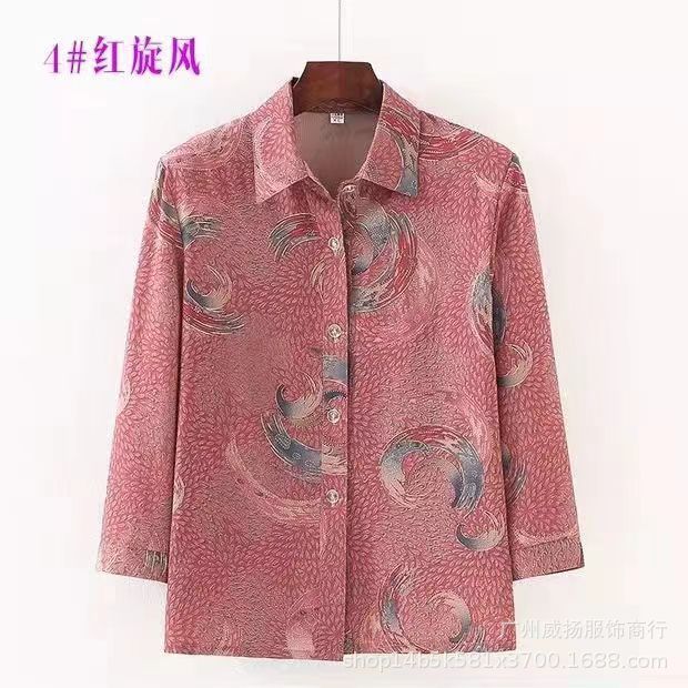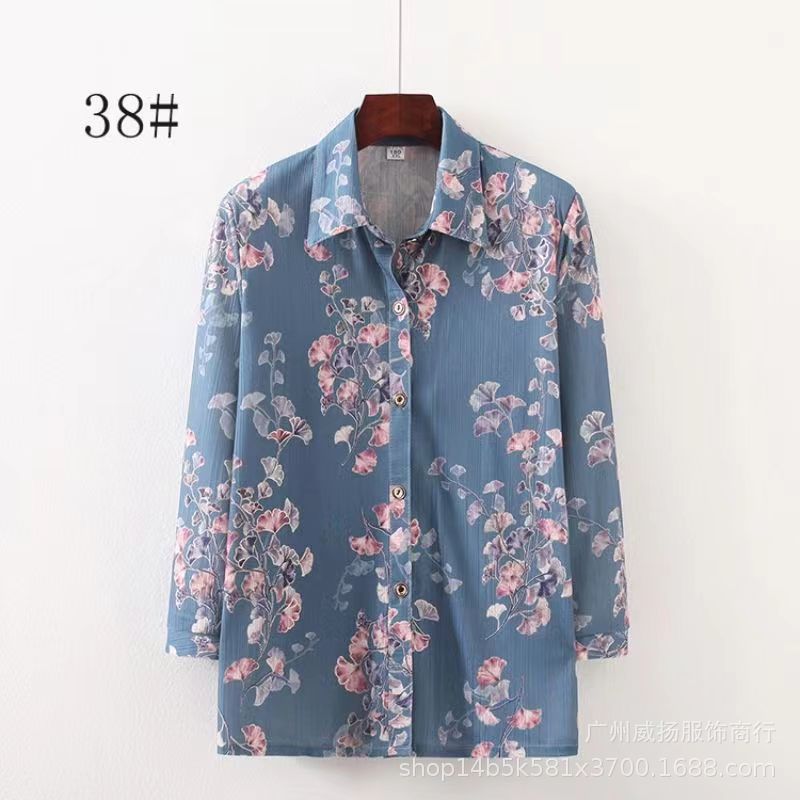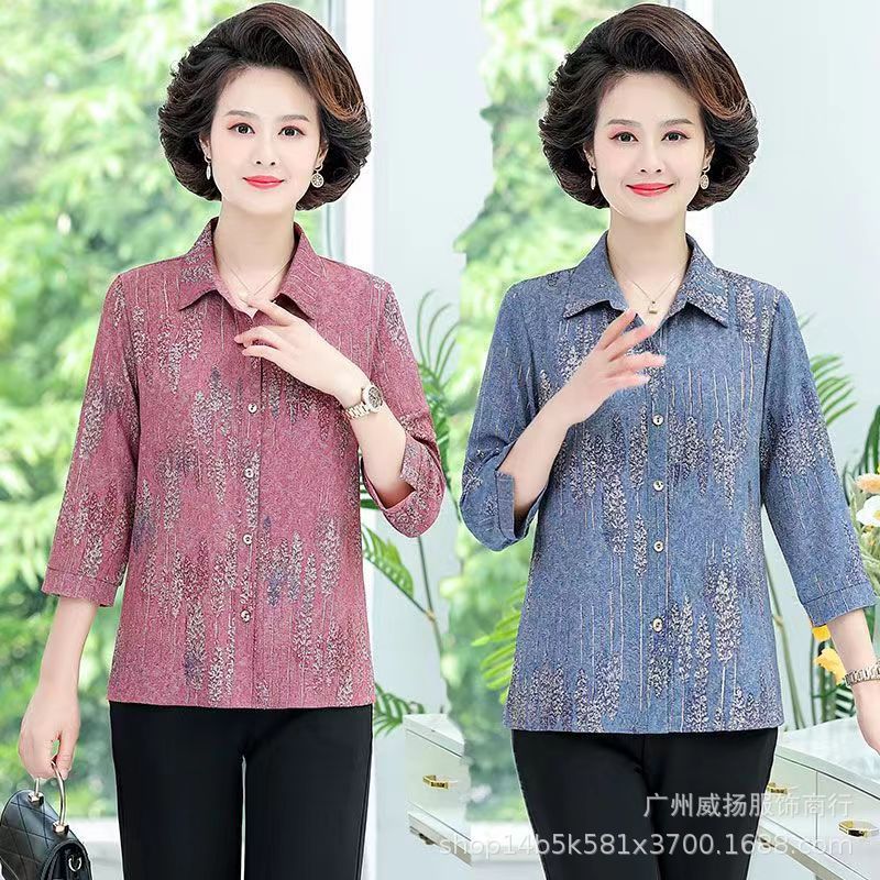 Spring and Summer 2024 New Middle-aged and Elderly Shirt Western Style Mother’s Women’s Cardigan Ice Silk Lel Long Sleeve T-Shirt