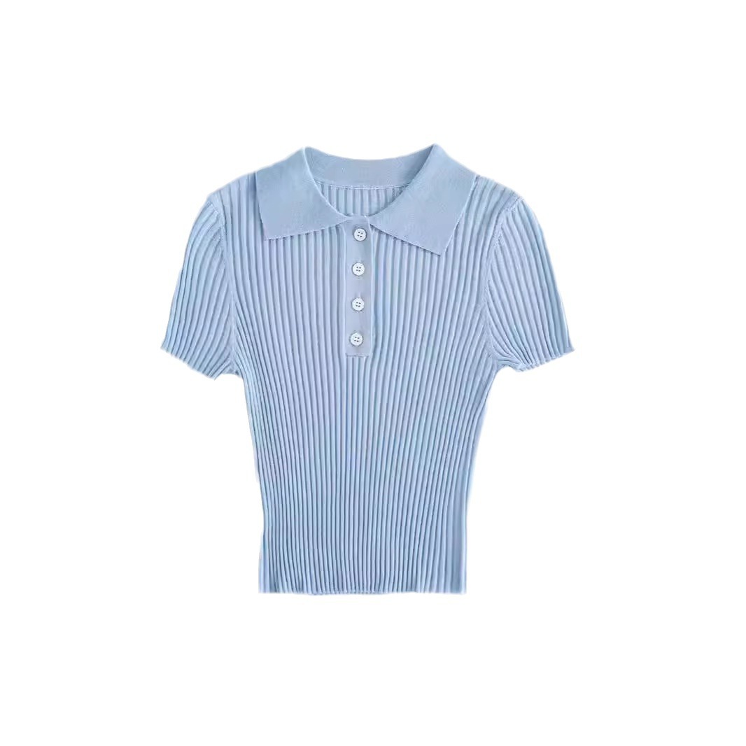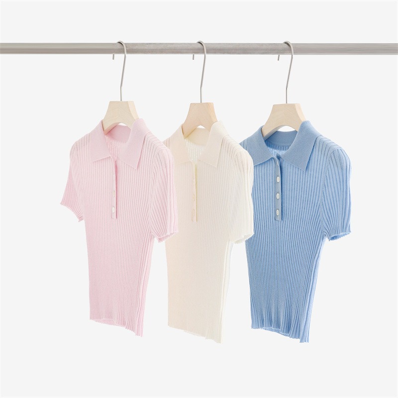 | nameOriginal | Spring and Summer 33 Wool Blended POLO Collar Pit Short-sleeved Knitted Sweater Women's Tight Waist Slimming Top Short Knitted T-shirt |