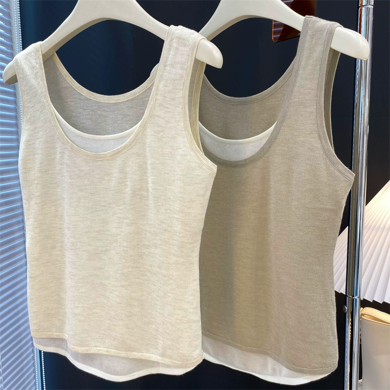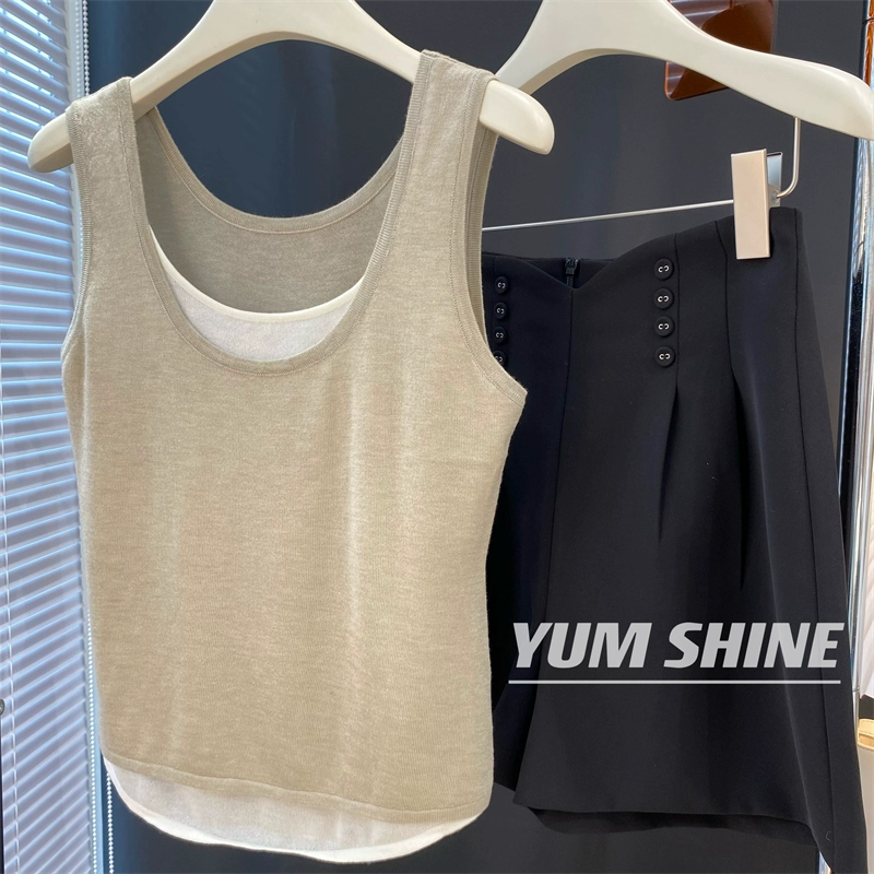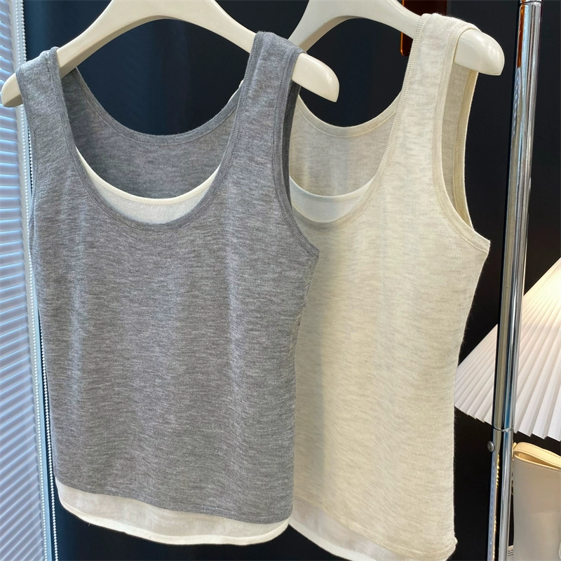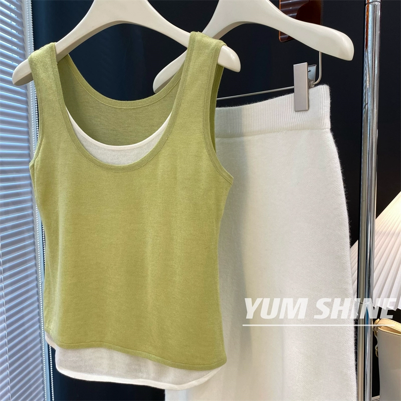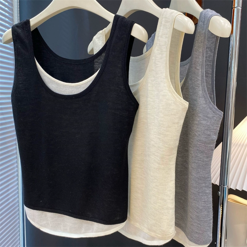 Spring and summer color-blocked fake two-piece loose sleeveless fine wool