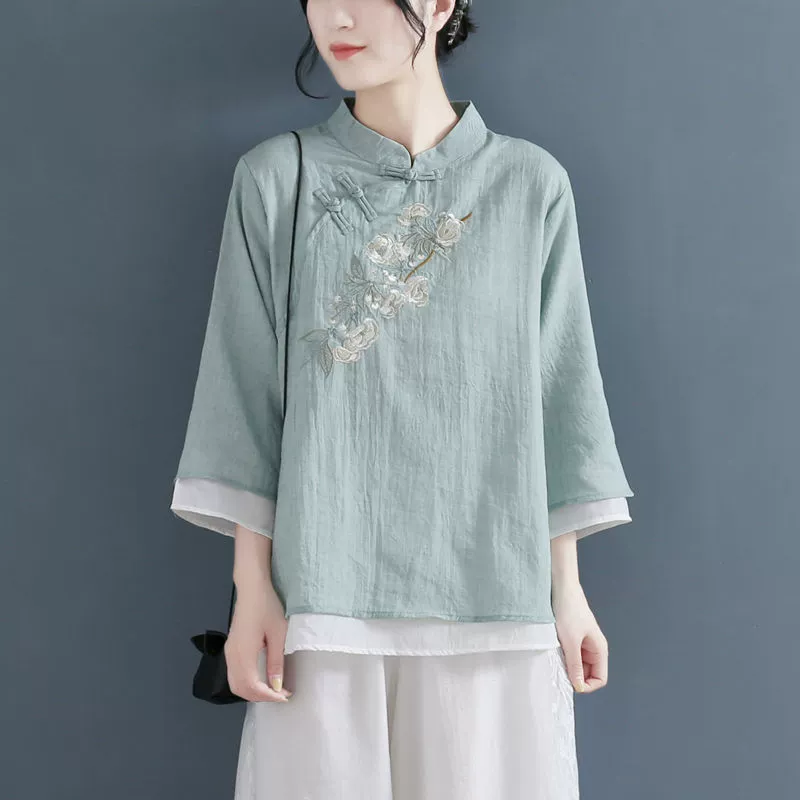 | nameOriginal | Spring and summer cotton and linen retro buckle three-quarter sleeves fake two pieces |