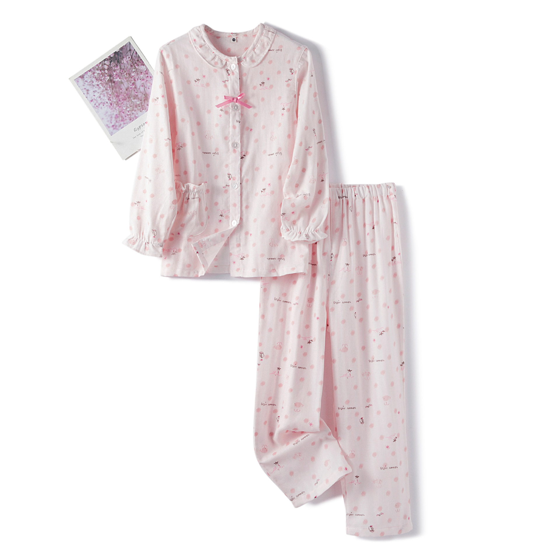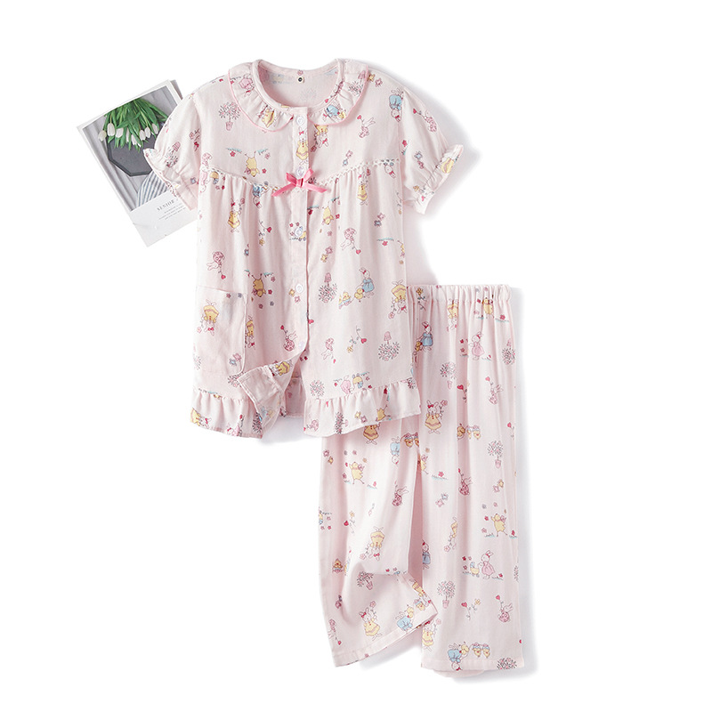 | nameOriginal | Spring and summer cotton double-layer yarn for boys and girls cute cartoon long short sleeve long shorts pajamas home clothing set Wholesale |