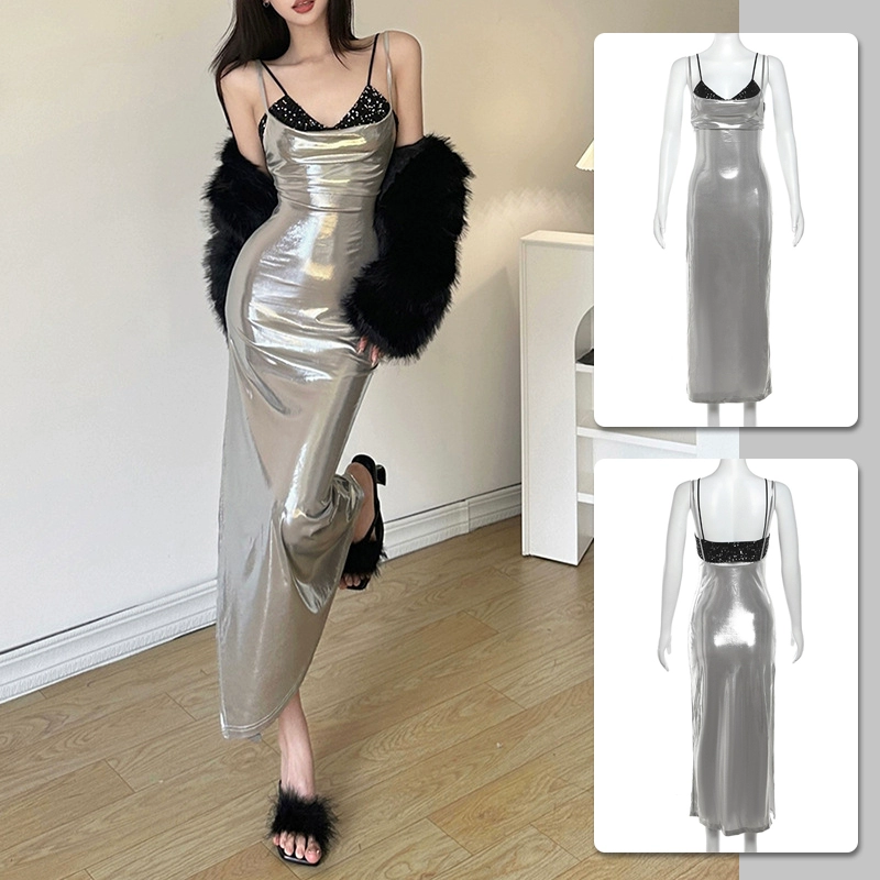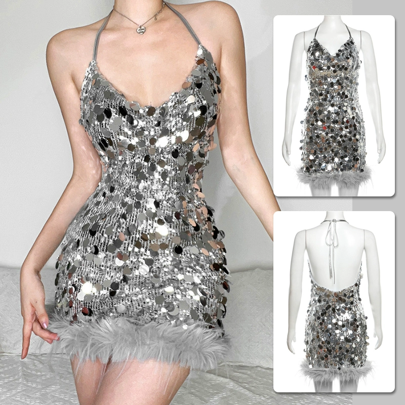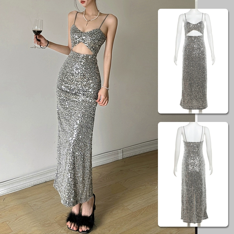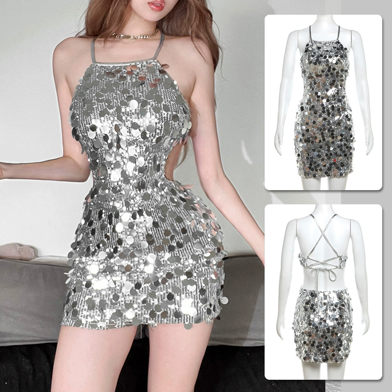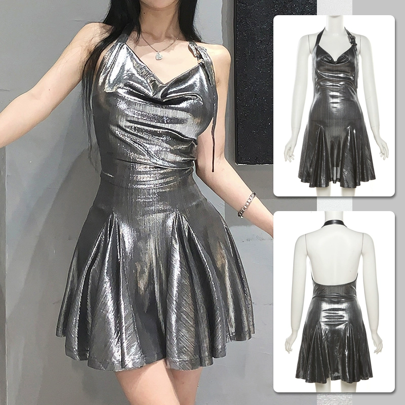 Spring and summer halter dress silver slim fit suspender