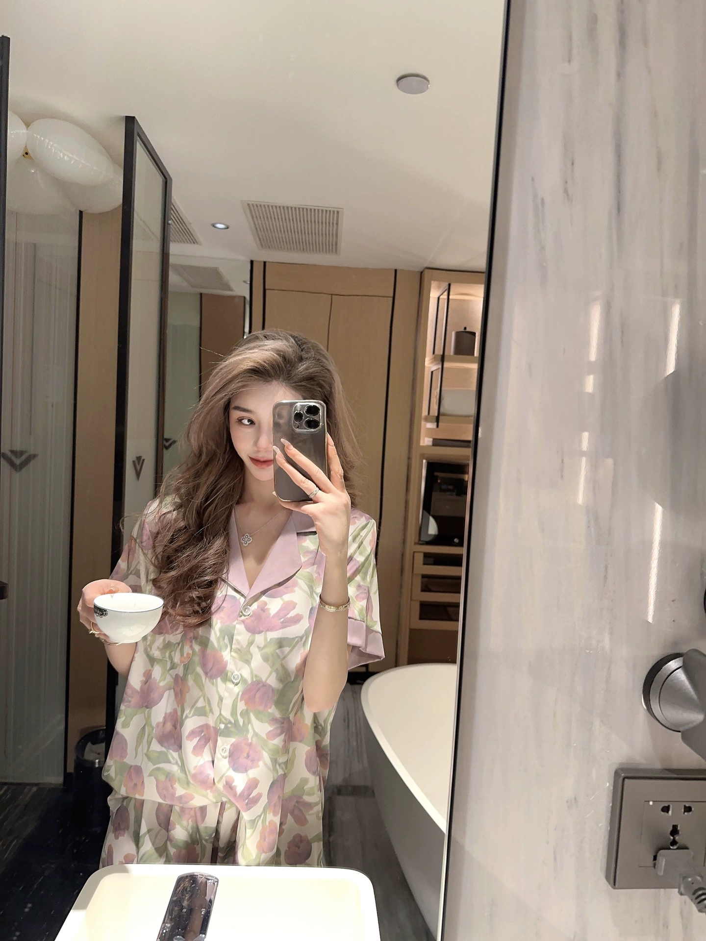 Spring and summer INS temperament ice silk tulip short-sleeved trousers pajamas lapel imitation silk flower taro mud purple home clothes