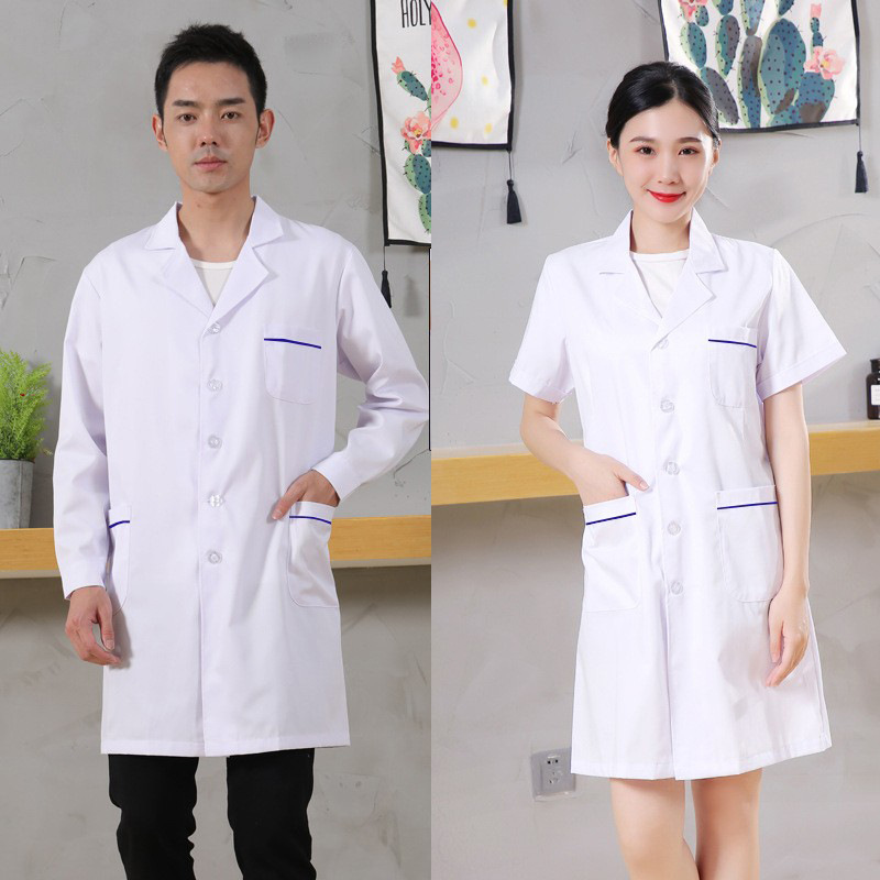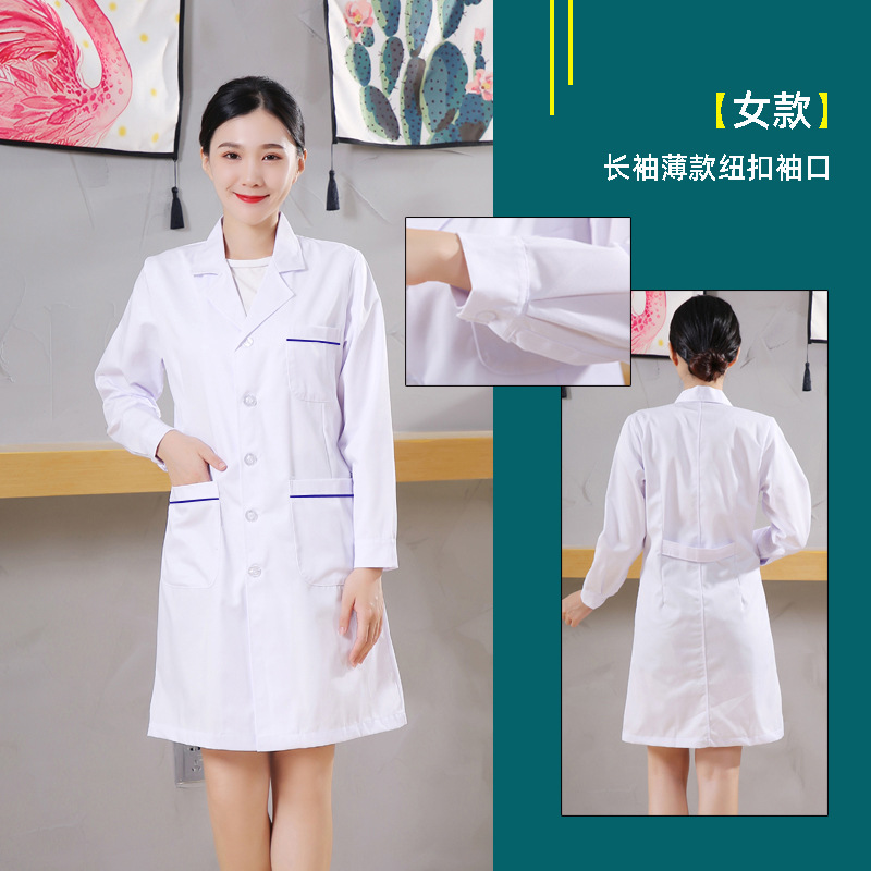 | nameOriginal | Spring and summer long-sleeved nurse pharmacy work clothes men's and women's half-sleeved clinic white gown blue edge Doctor Doctor doctor clothing pharmaceutical factory |