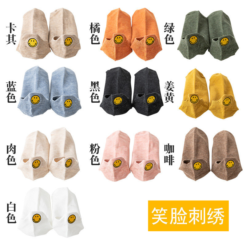 | nameOriginal | Spring and Summer New Embroidered Expression Left and Right Foot Puppy Breathable Cotton Boat Socks Women's Smiley Funny Cartoon Socks |