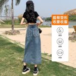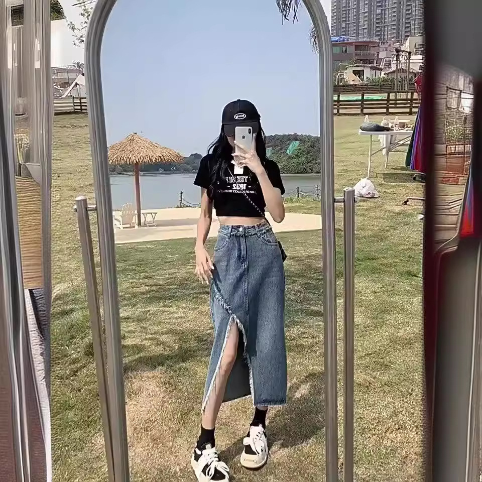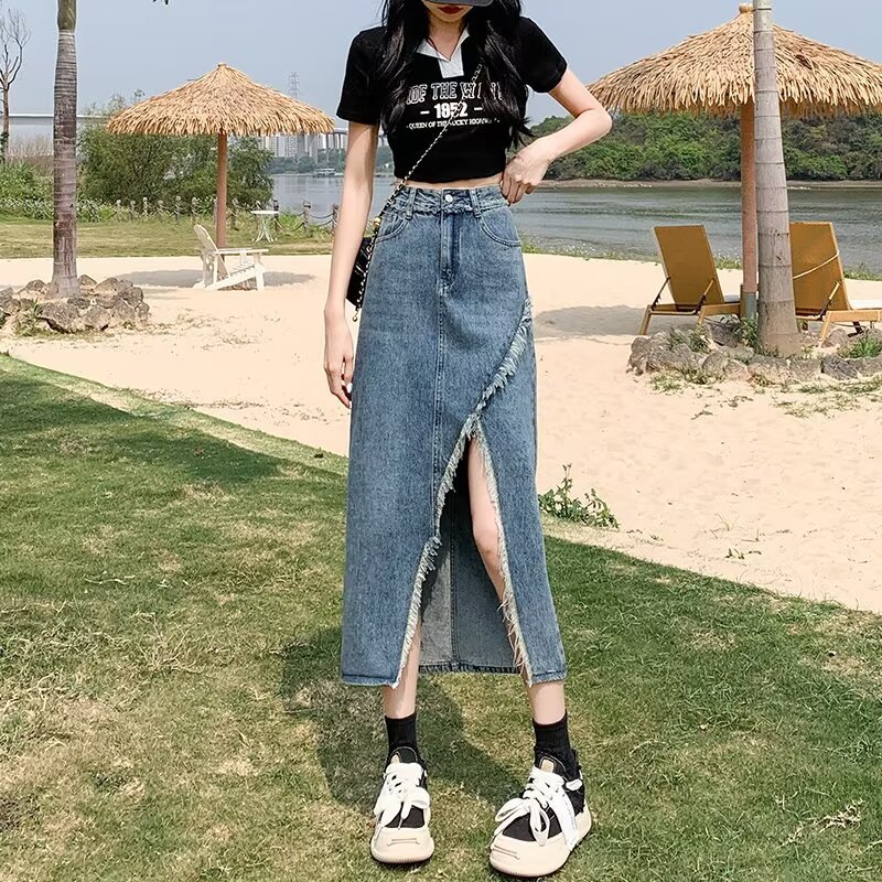 Spring and Summer New High Waist Slimming Irregular Split Denim Skirt Retro Fur Edge Design Sense A- word Mid-length Skirt