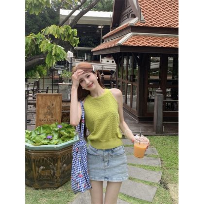 | nameOriginal | ~ Spring and Summer New ~ Lime Bubble Knitted Shirt Sling Vest Women's Lazy Round Neck Sleeveless Top |