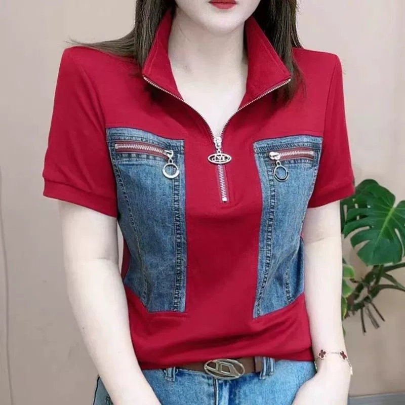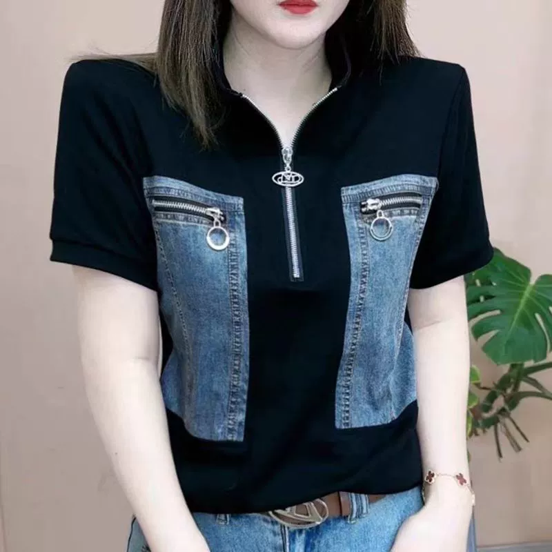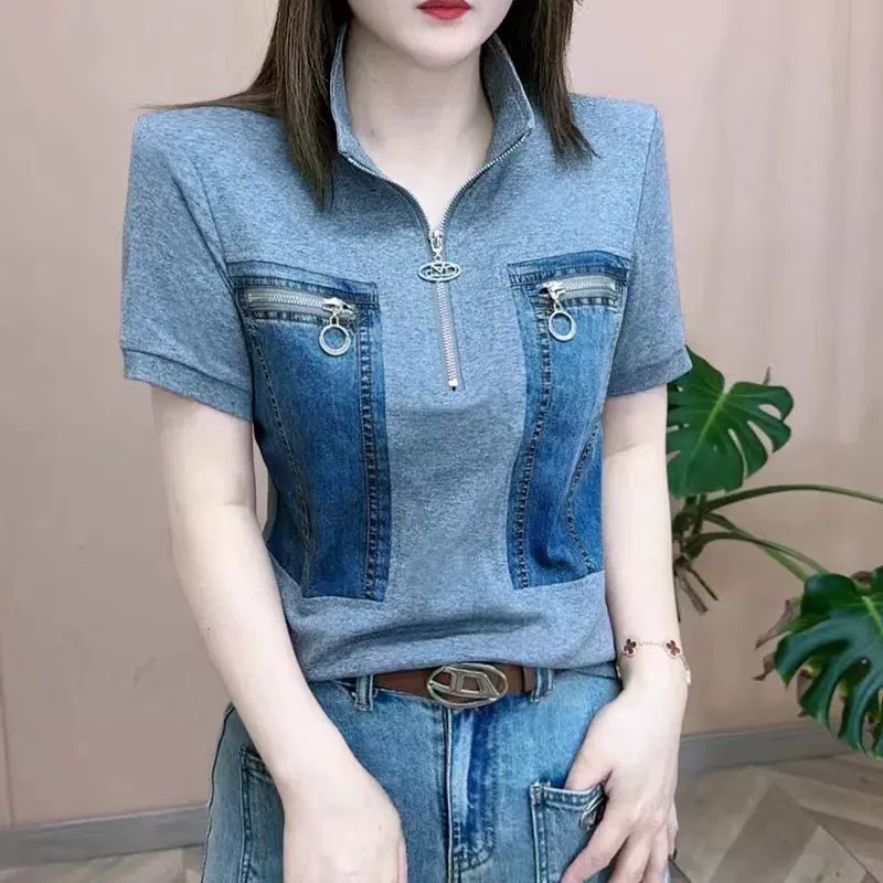| nameOriginal | Spring and summer pure cotton stand collar splicing casual denim short sleeves |