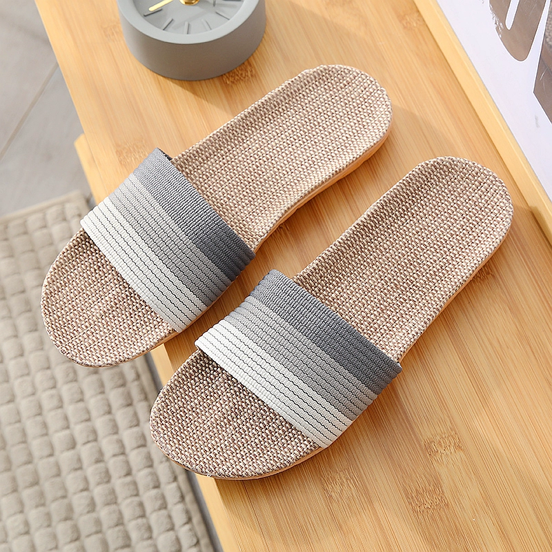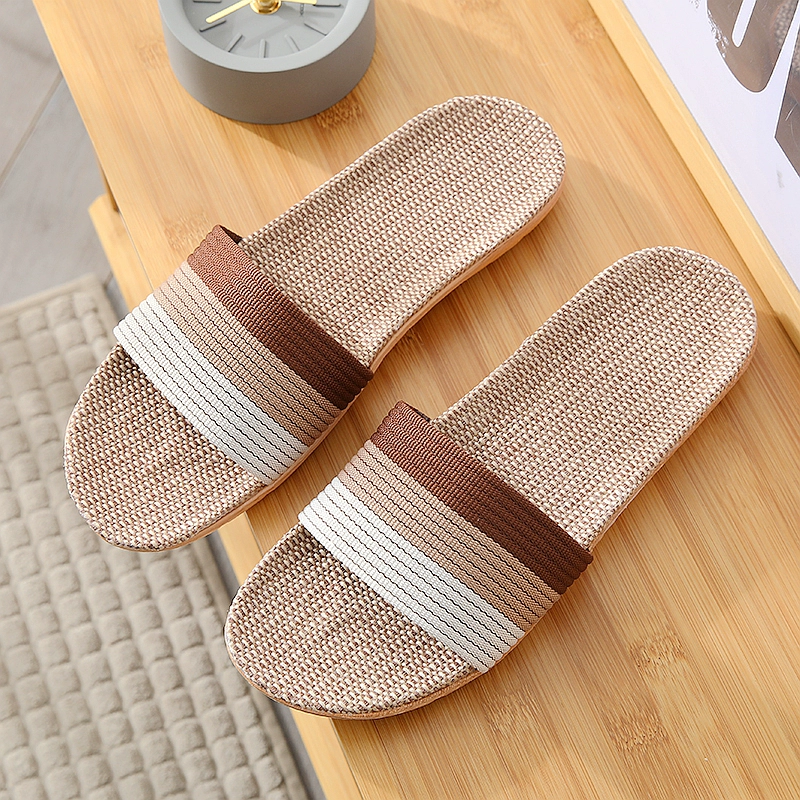 | nameOriginal | Spring and summer seasons home couple sweat-absorbent striped linen slippers for women, non-slip thick-soled indoor floor casual slippers |