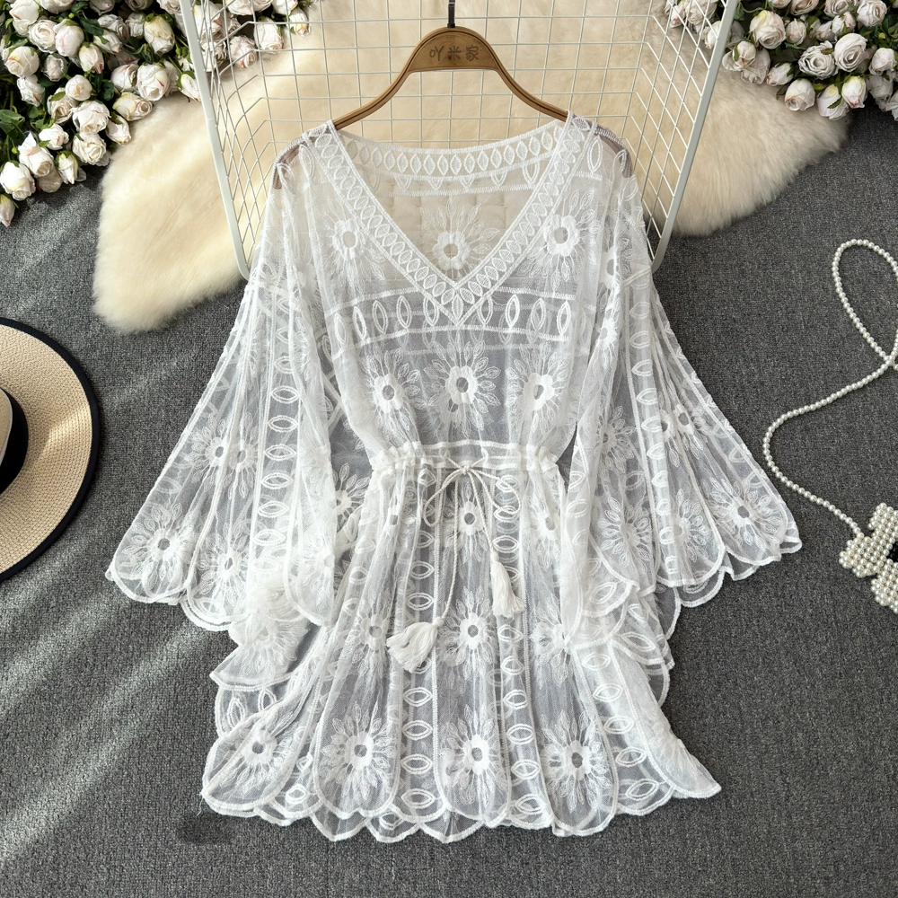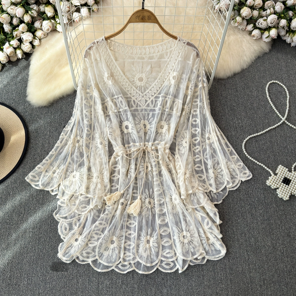 | nameOriginal | Spring and summer short long-sleeved blouse outer tower top for women new hollow jacquard skirt travel beach sun protection dress |