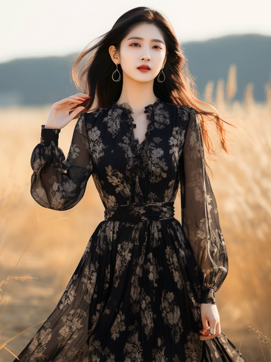 | nameOriginal | Spring and summer slimming big floral chiffon long-sleeved little black dress |