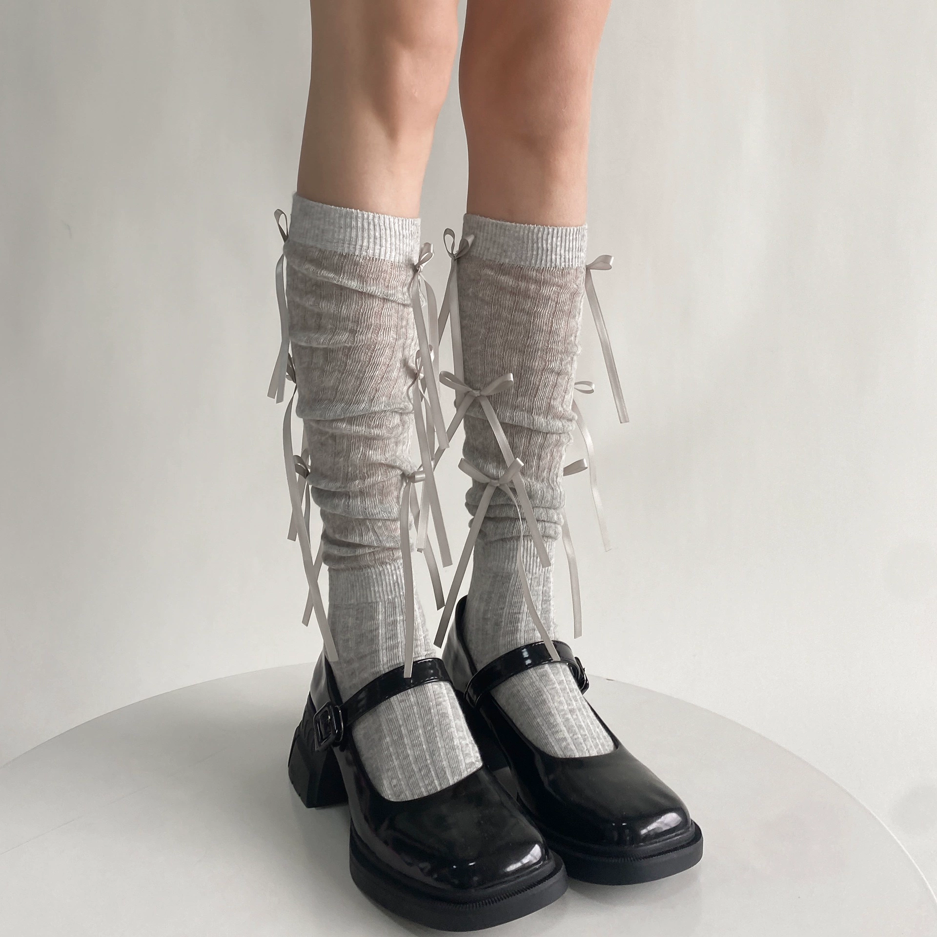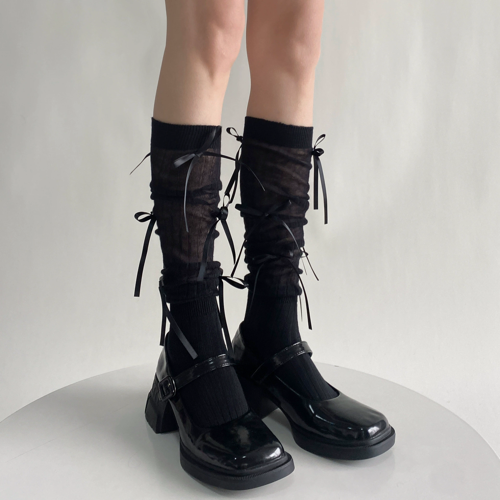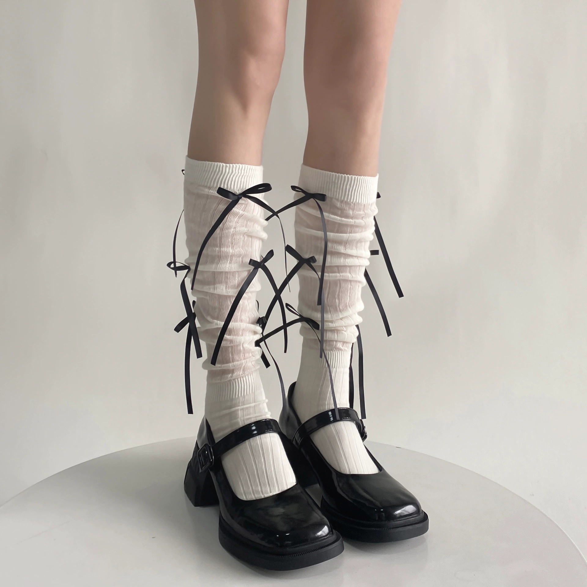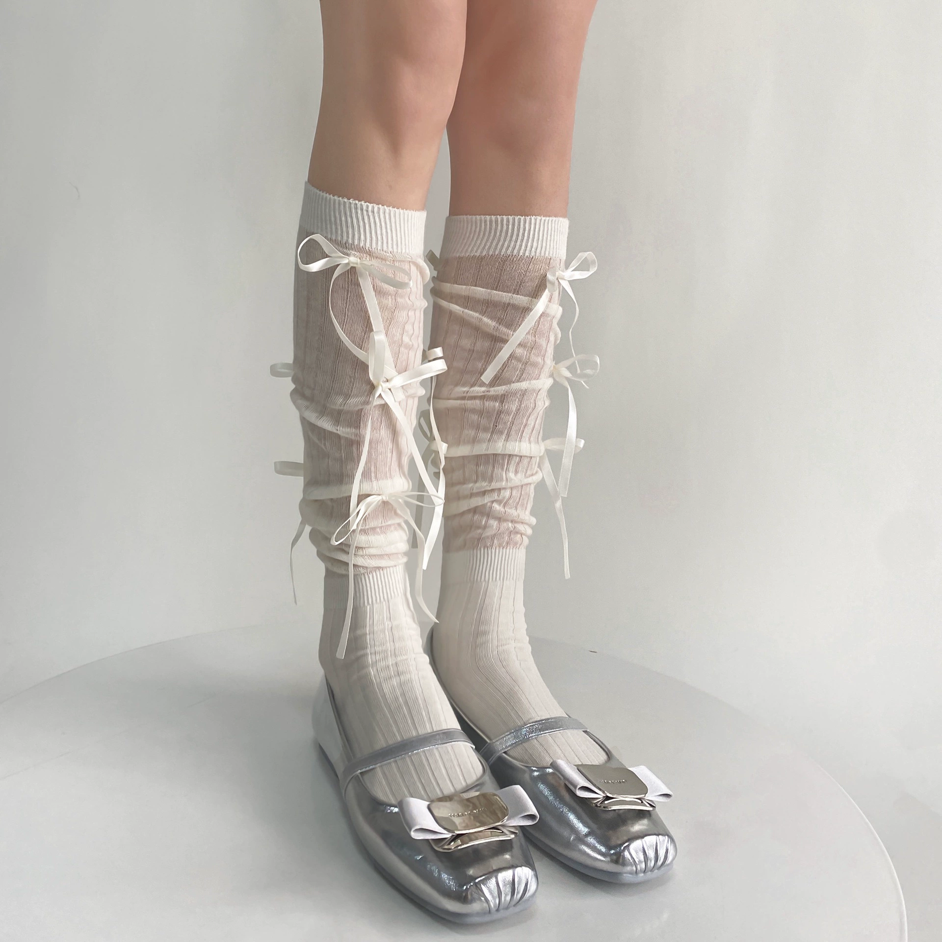 Spring and summer thin ballet style ribbon bow pile socks women's stockings spliced ​​sweet college style jk calf socks