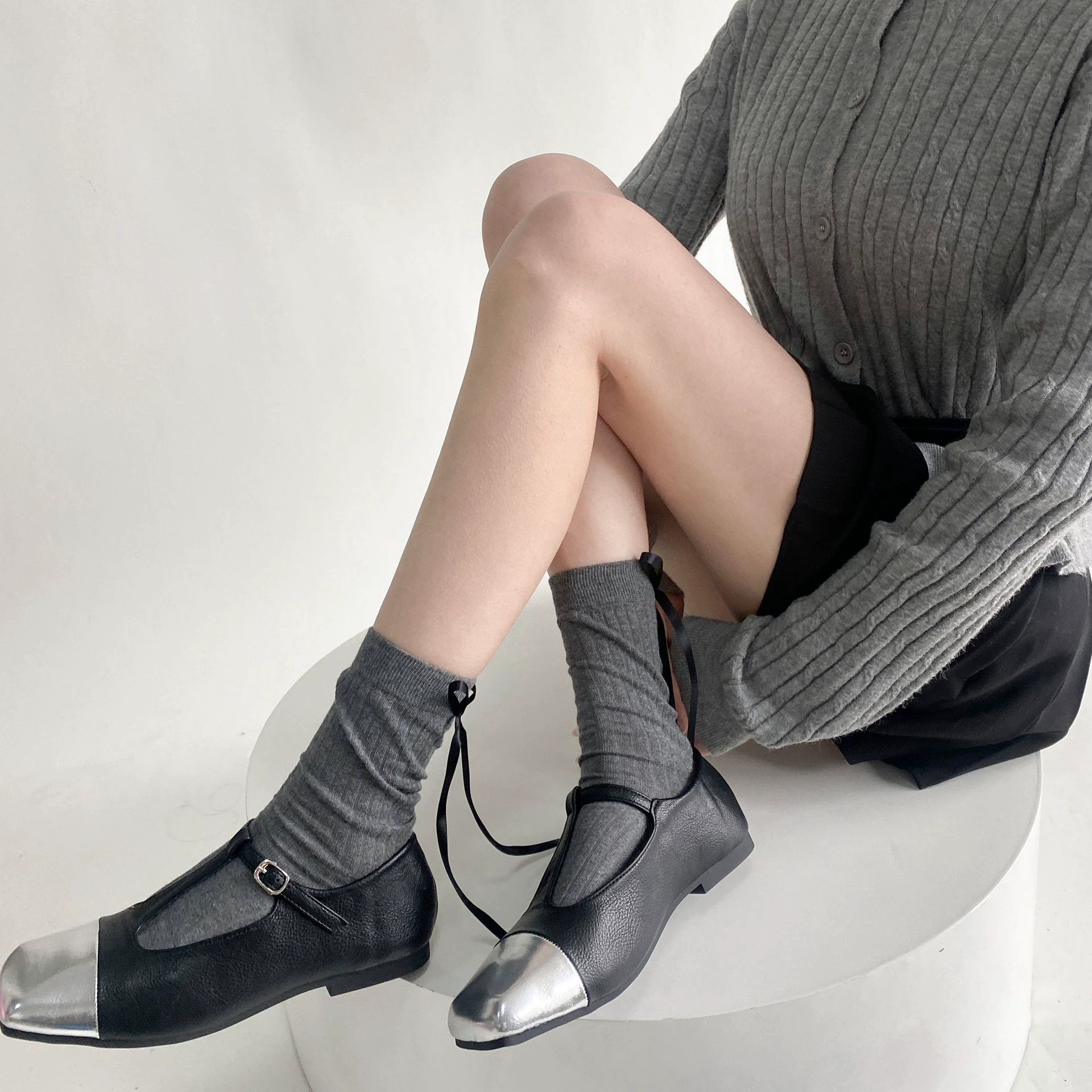 Spring and summer thin heel strap bow ballet style pile calf socks for women solid color versatile simple medium socks