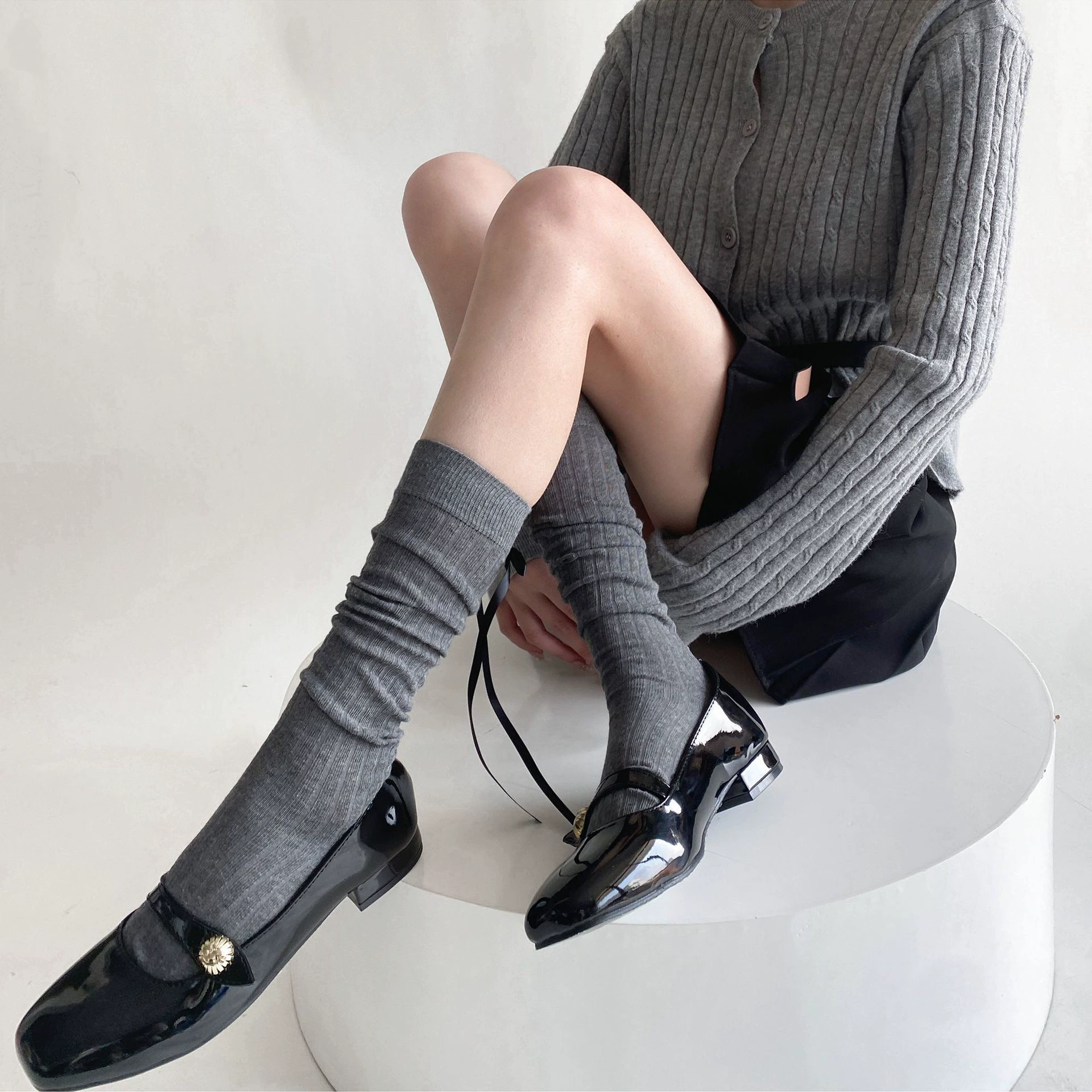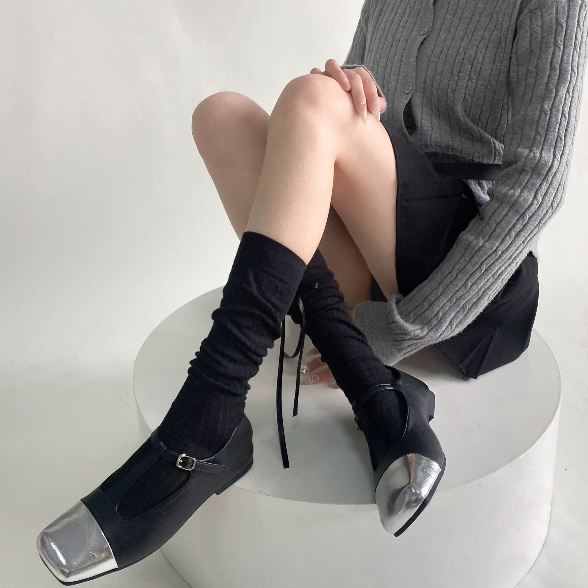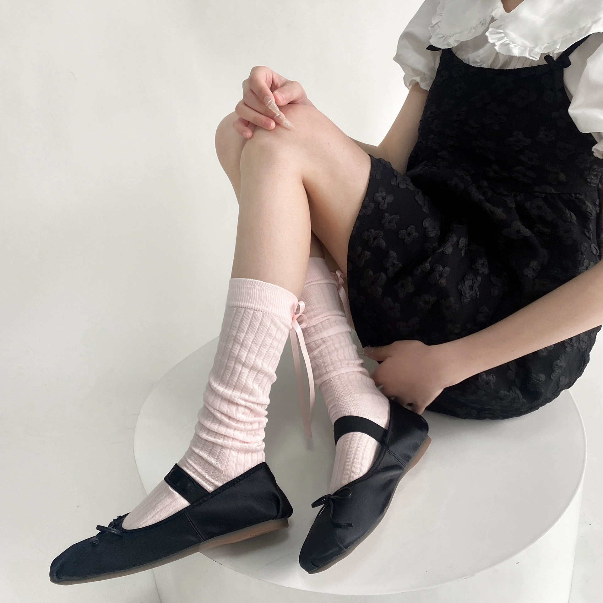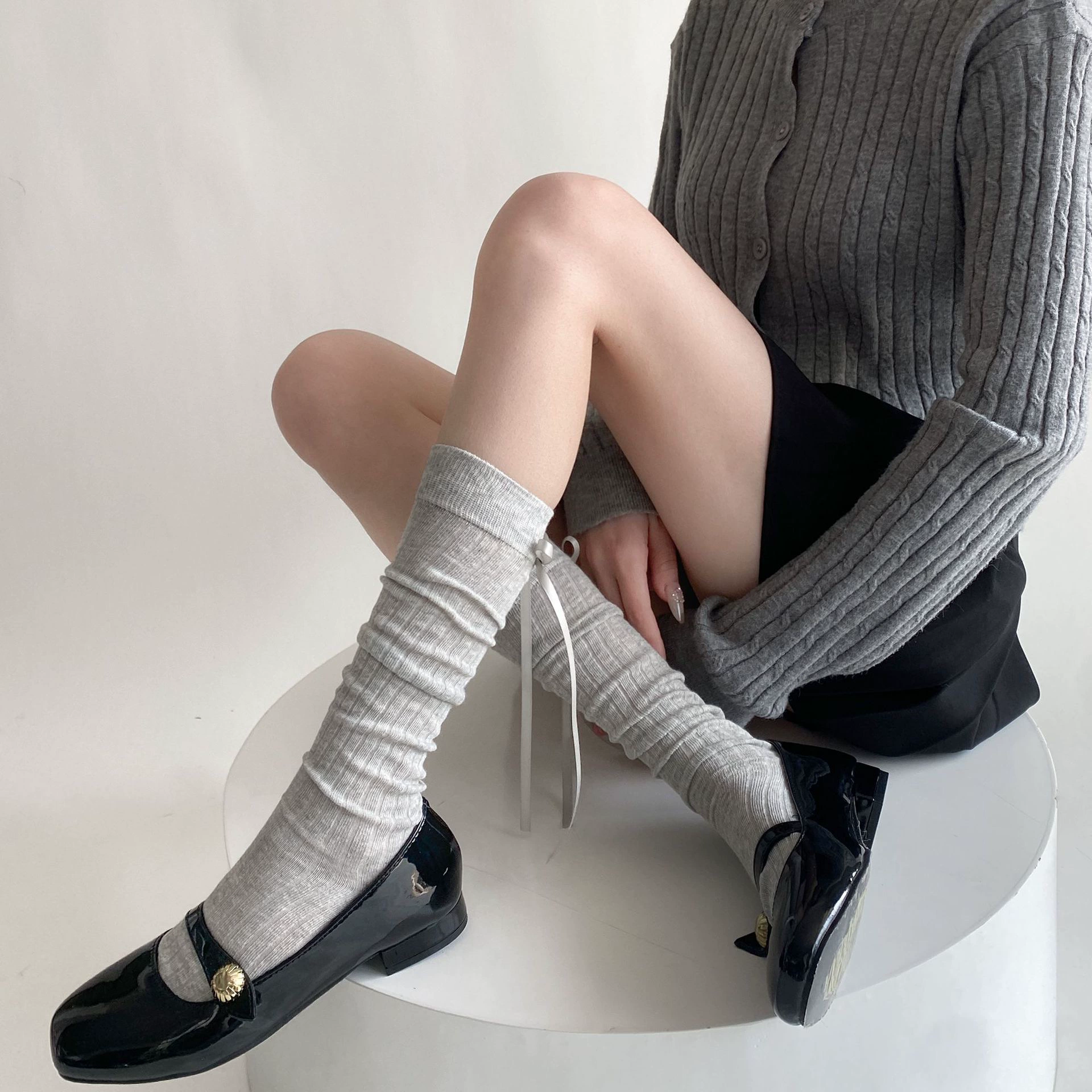 Spring and summer thin heel strap bow ballet style pile calf socks for women solid color versatile simple mid-calf socks