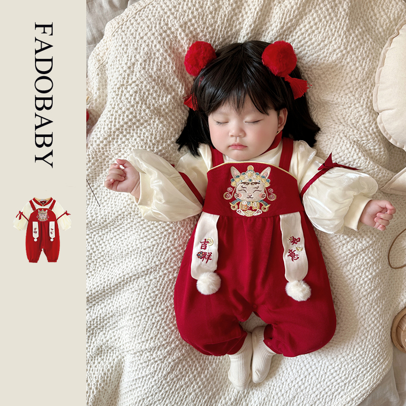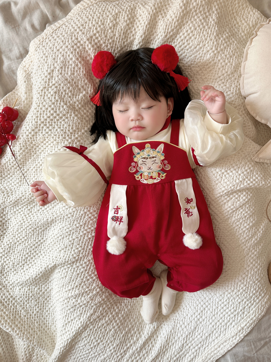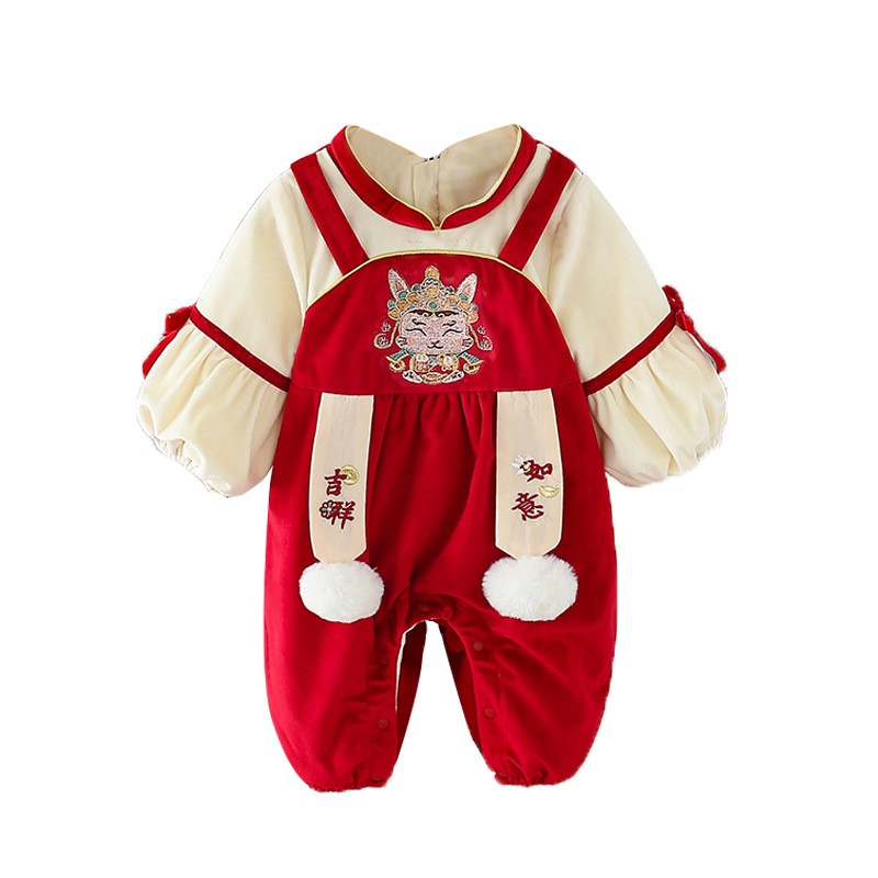 | nameOriginal | Spring baby clothes festive red jumpsuit baby girl full moon hundred days old dress spring and autumn outfits |