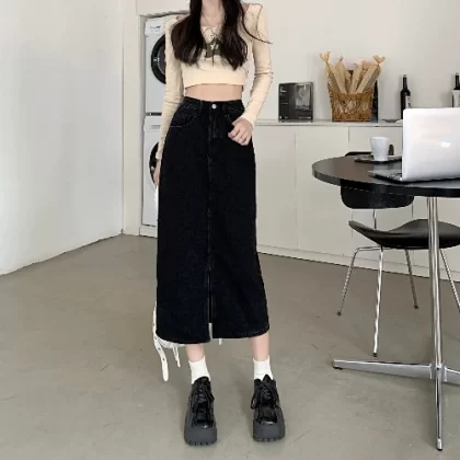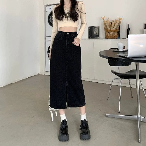| nameOriginal | Spring black design slit hip-hugging denim skirt |