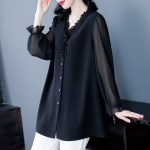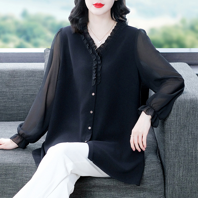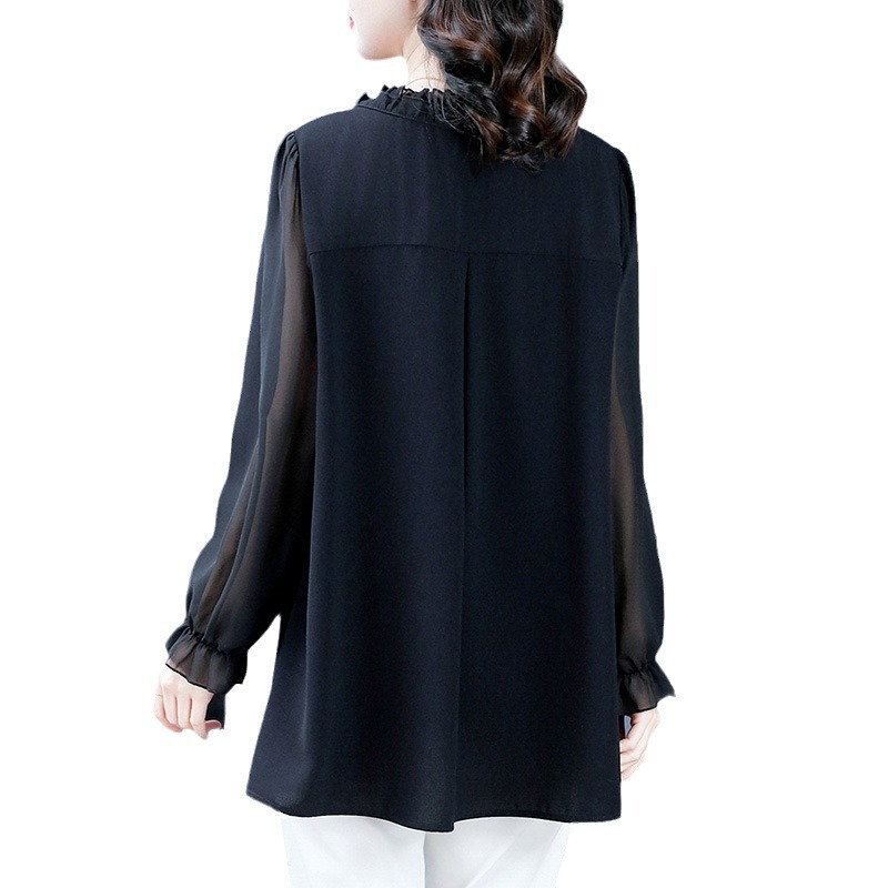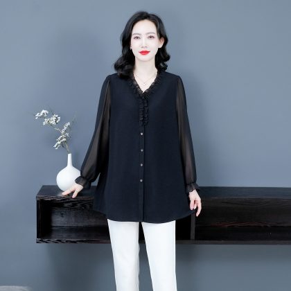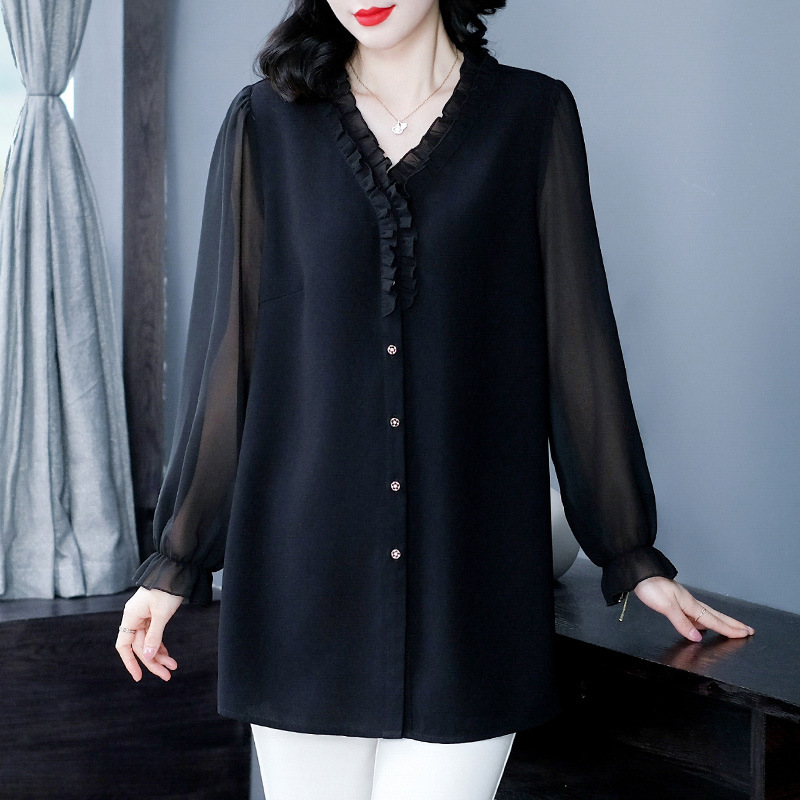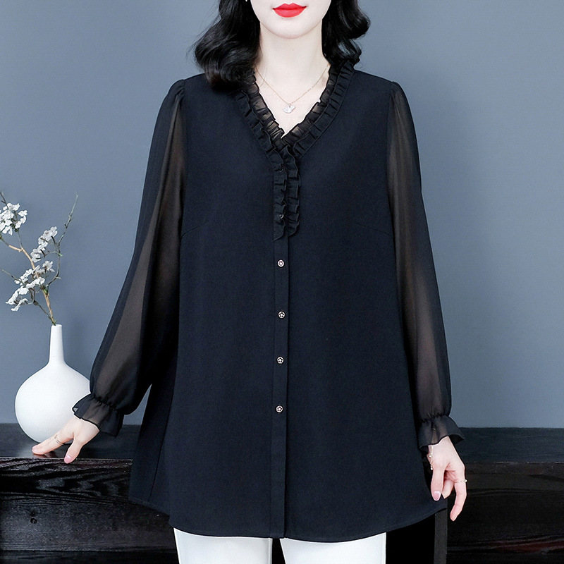 | nameOriginal | Spring chiffon loose wooden ear cardigan V-neck bottoming loose plus size long sleeve mom shirt middle-aged and elderly women's clothing |