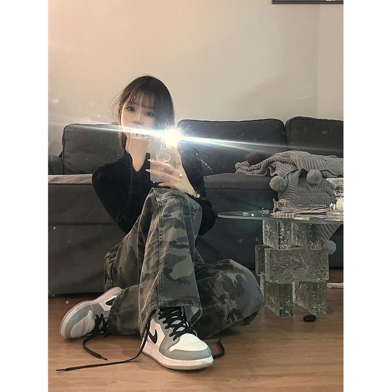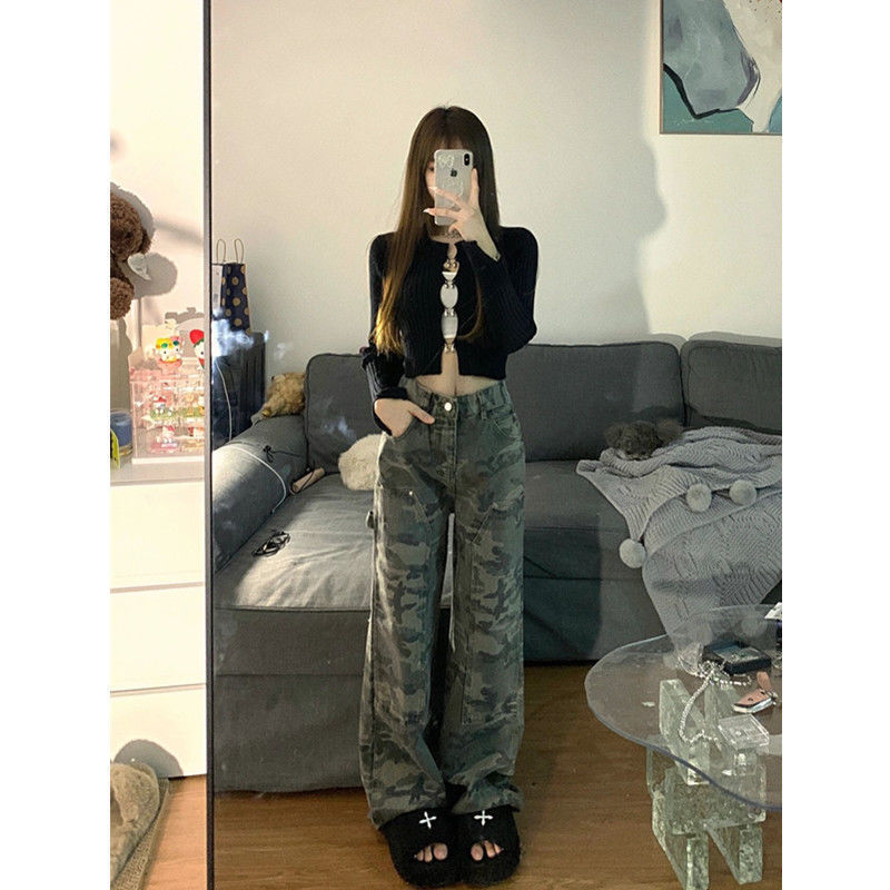 | nameOriginal | Spring Hong Kong style retro workwear camouflage jeans women's hot girl high waist straight loose casual wide leg long pants fashion |