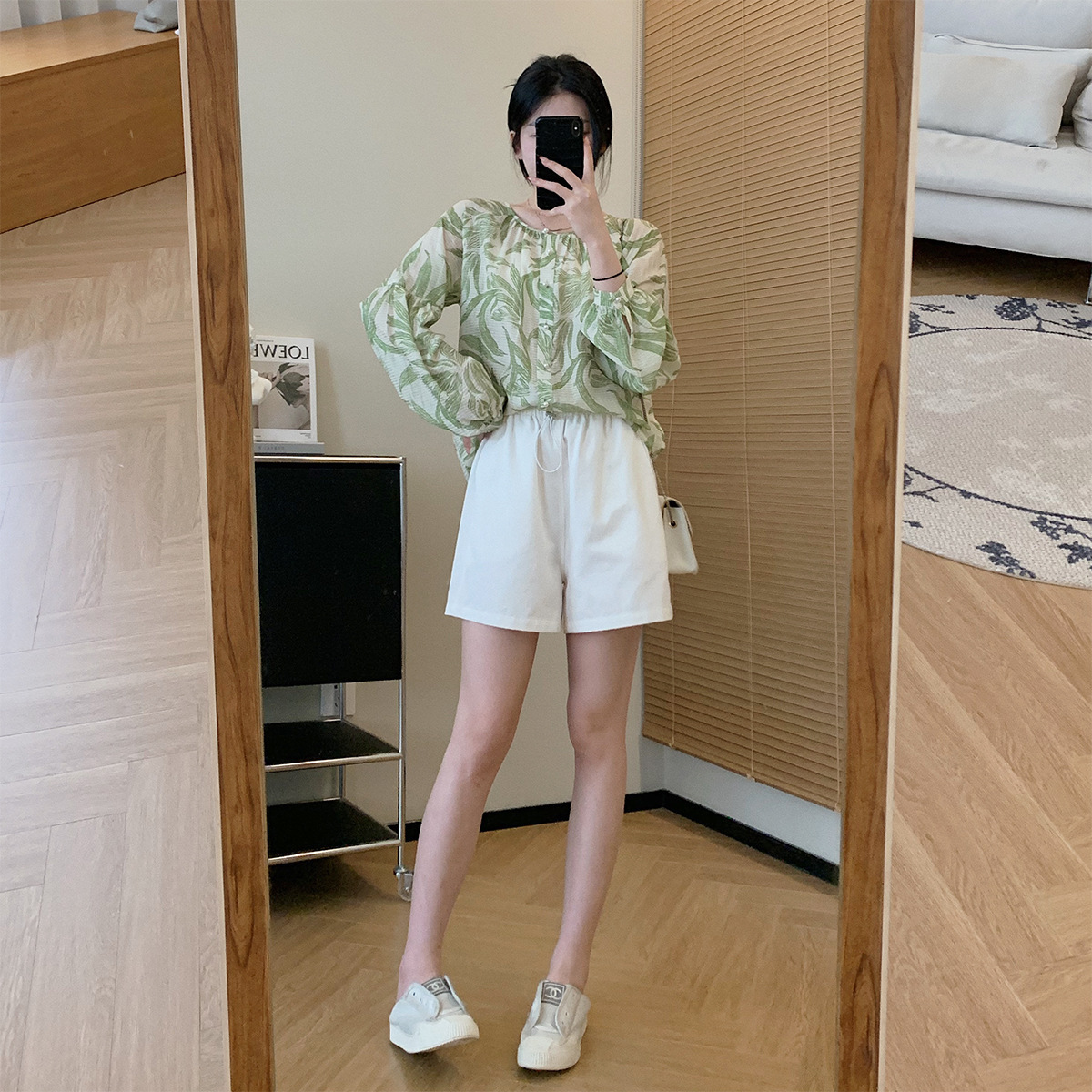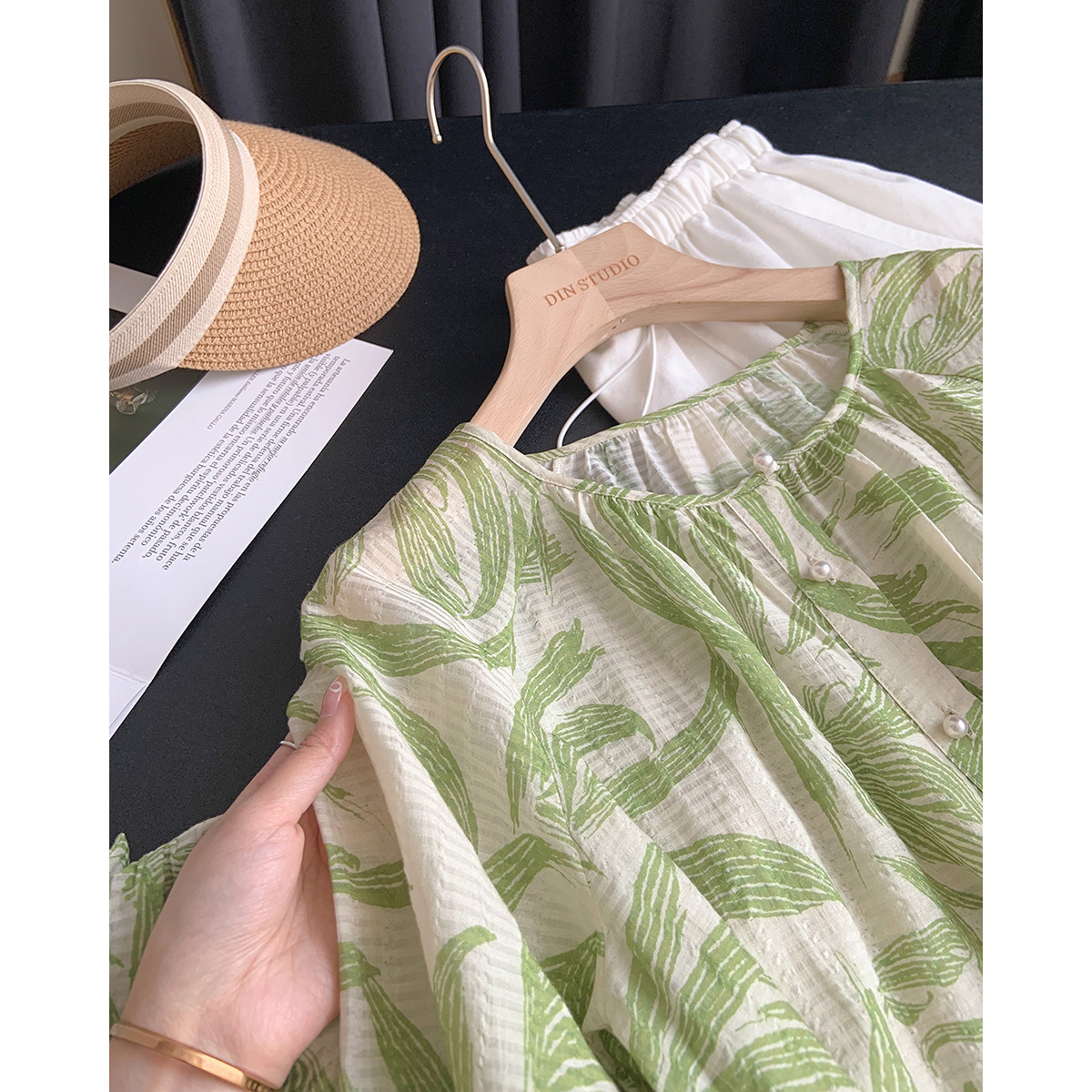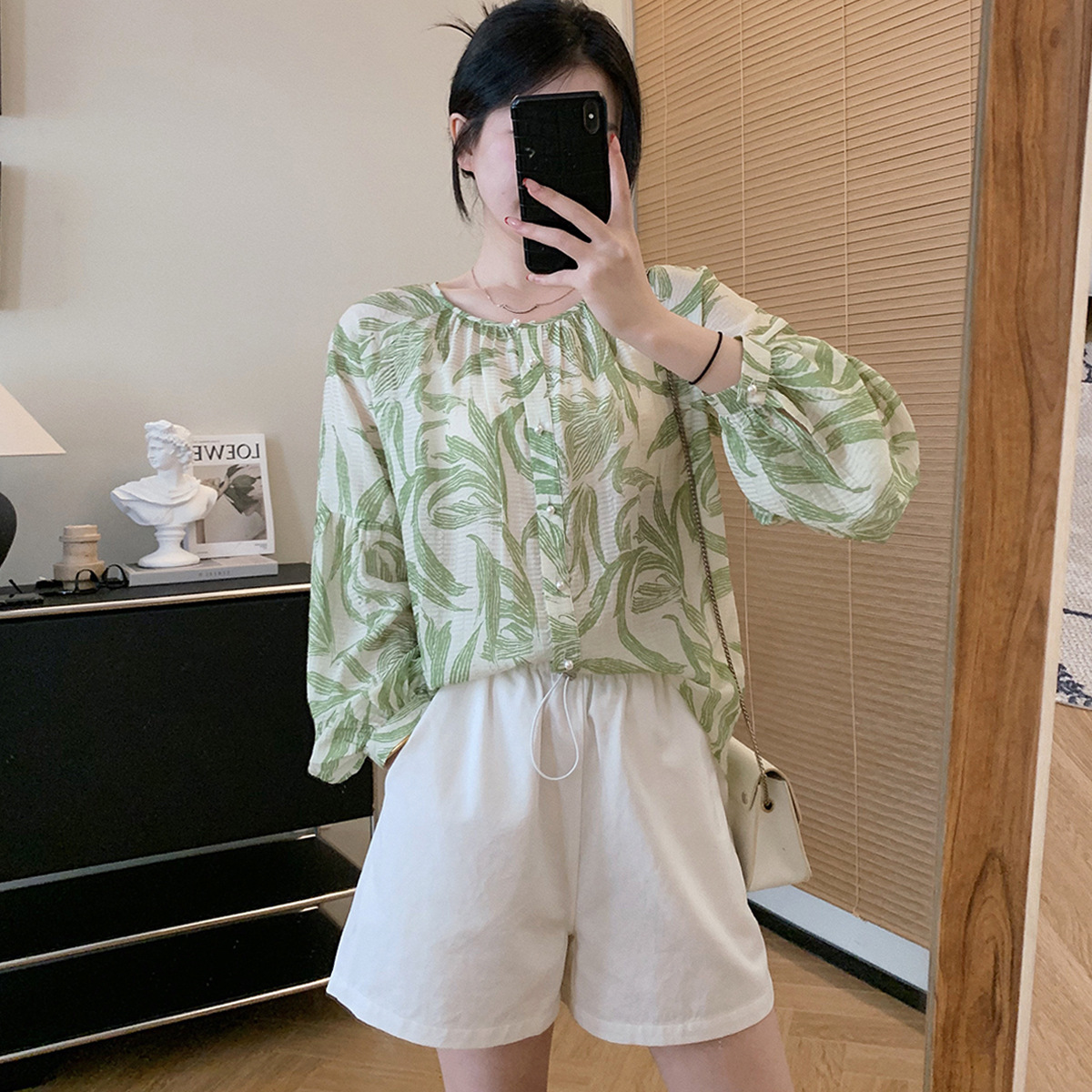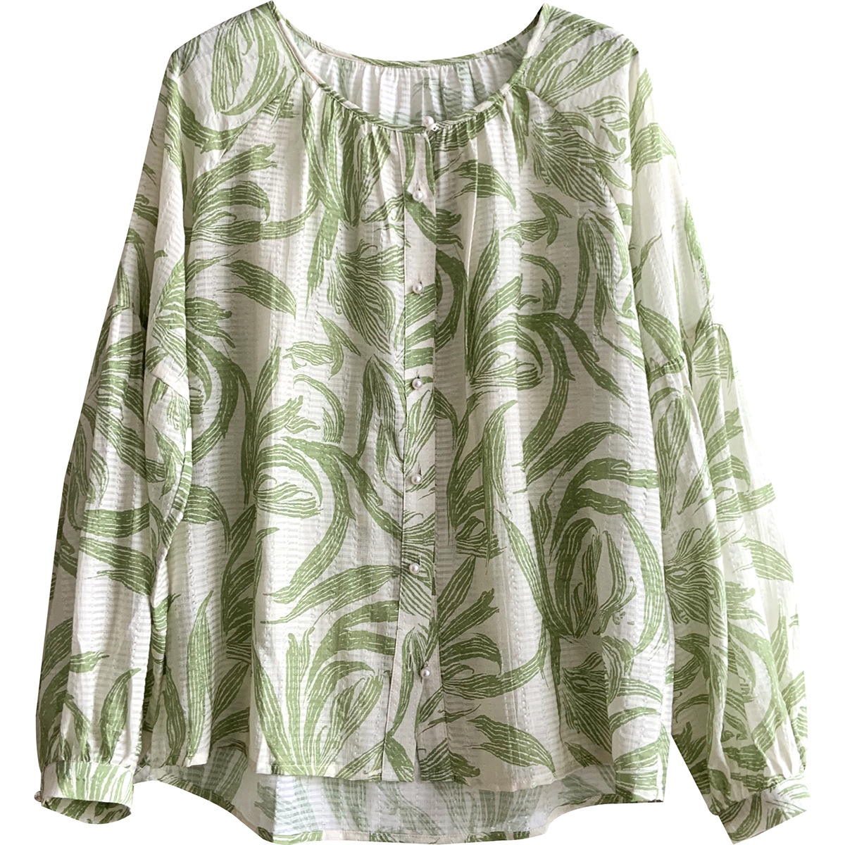 | nameOriginal | Spring is not too late French holiday style plant printed pearl buckle long sleeve sunscreen shirt women's summer loose thin top |