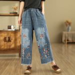 | nameOriginal | Spring jeans women's new ethnic style plus size embroidered elastic waist wide-leg pants ripped retro cropped jeans |