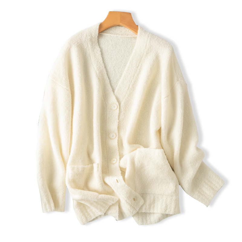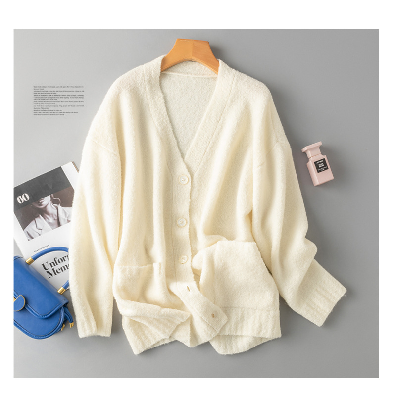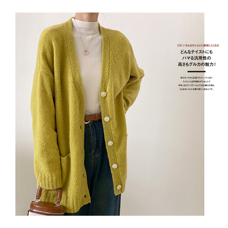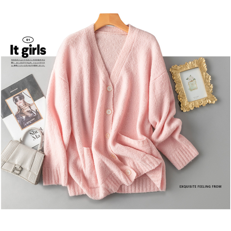 Spring Knitwear loose V-neck pocket mid-length soft macaron woolen sweater Puyuan women’s cardigan