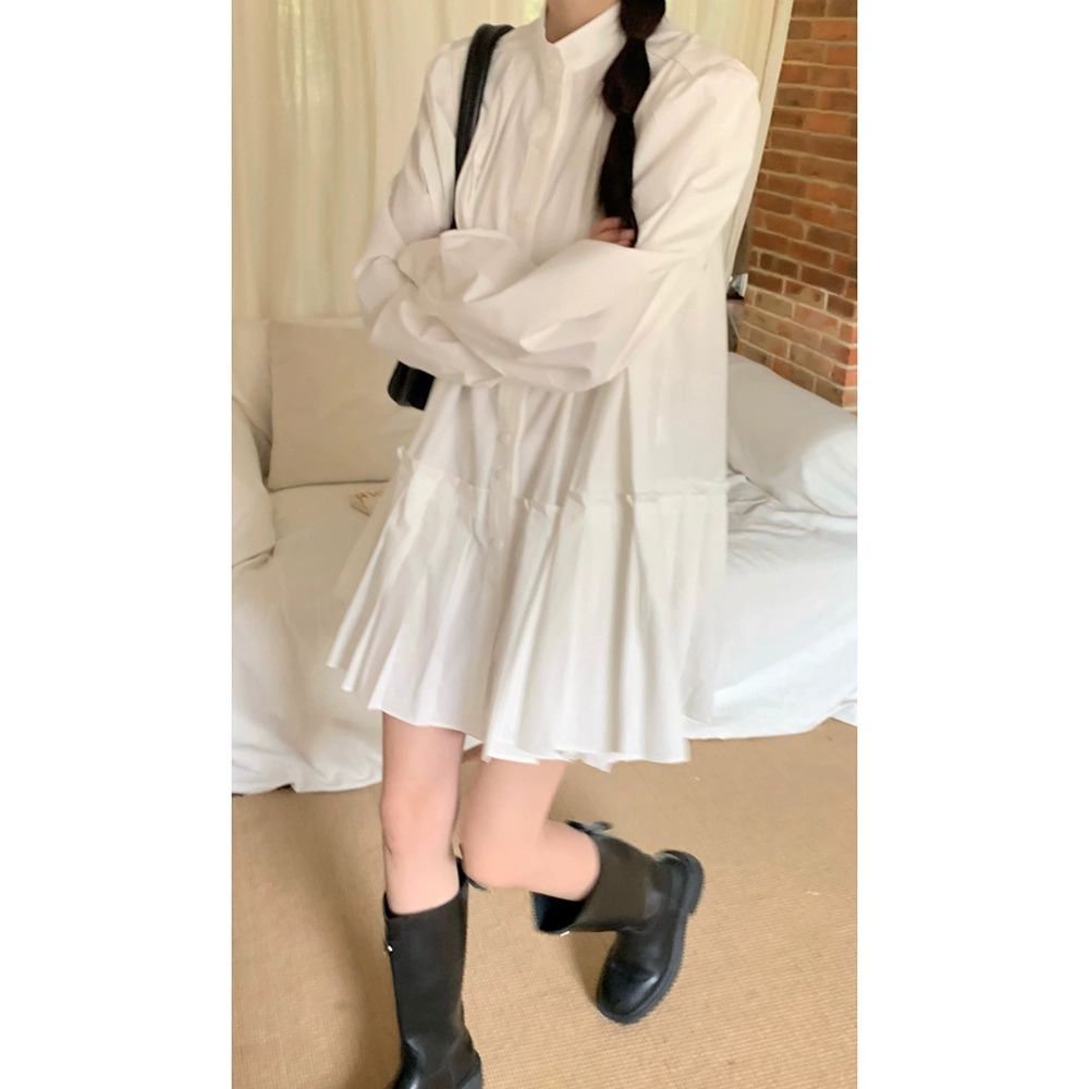 | nameOriginal | Spring loose stand-up collar pleated skirt A-line white shirt |
