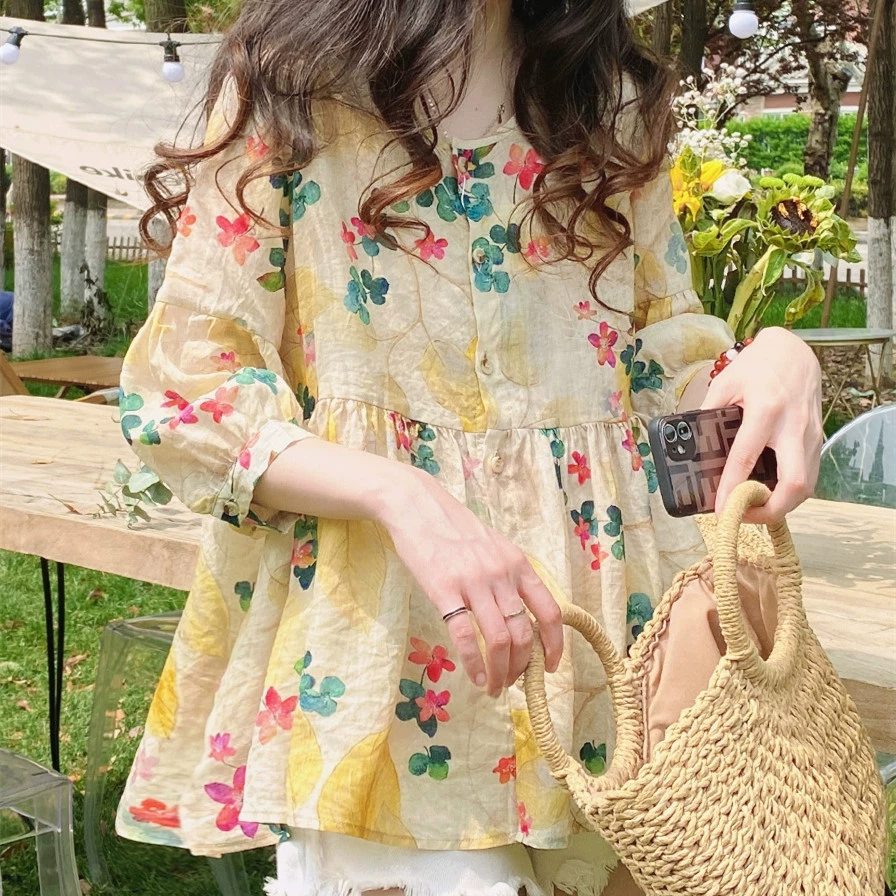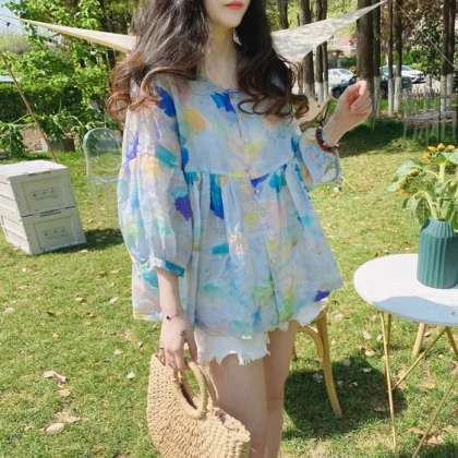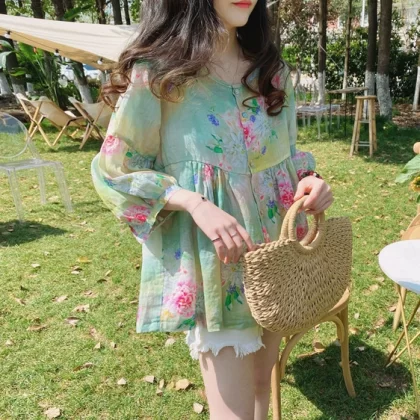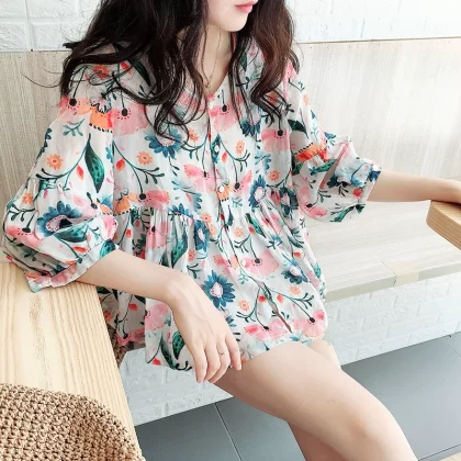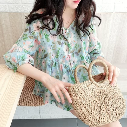 Spring new Korean style thin loose belly-covering women’s summer top for women’s floral chiffon shirt mid-sleeved A-line doll shirt