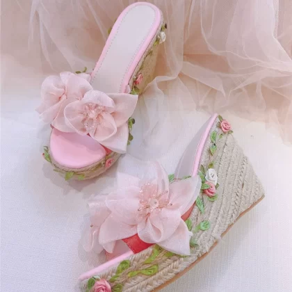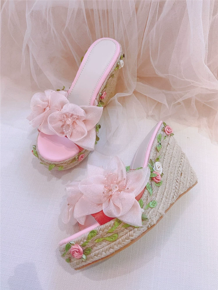 | nameOriginal | Spring new sweet girly wedge heel straw outer sandals flower fairy pink genuine leather original one-strap sandals |